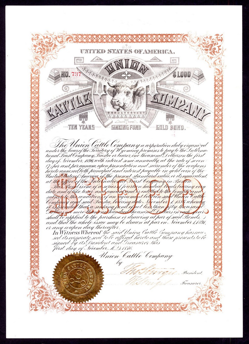 Union Cattle Co., 10-year sinking fund gold bond for $1000, 1886, #737, cows head in centre, ornate border, brown and black, gold seal depicting S over 0-0 brand, with coupons, GVF.