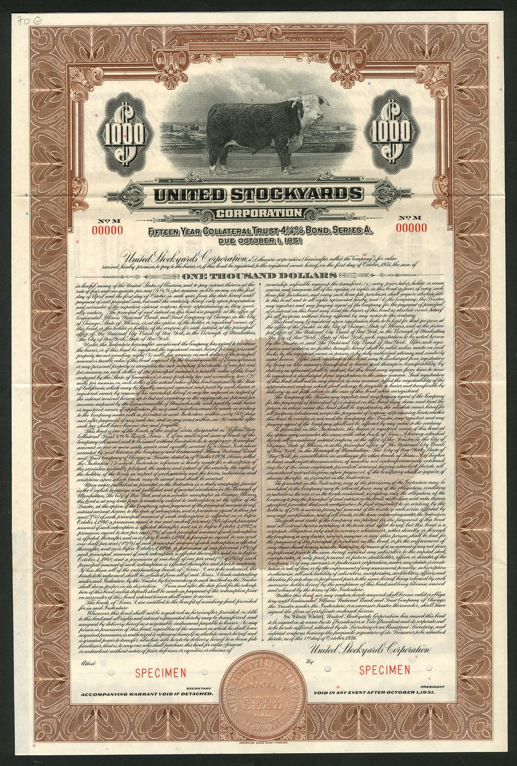 United Stockyards Corporation, specimen $1000 bond, no.M00000, 1936, vignette of bull top centre, decorative border, engraved by American Bank Note Company, black and brown, with coupons, EF.