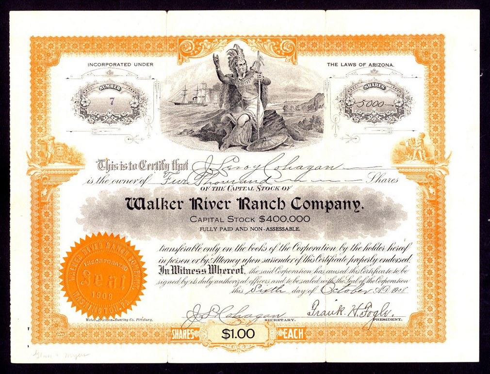 Walker River Ranch Co. (AZ), $1 shares, 19[08], #7, native American at op, ornate border, orange and black, printed by Goes, couple of edge splits but VF.
