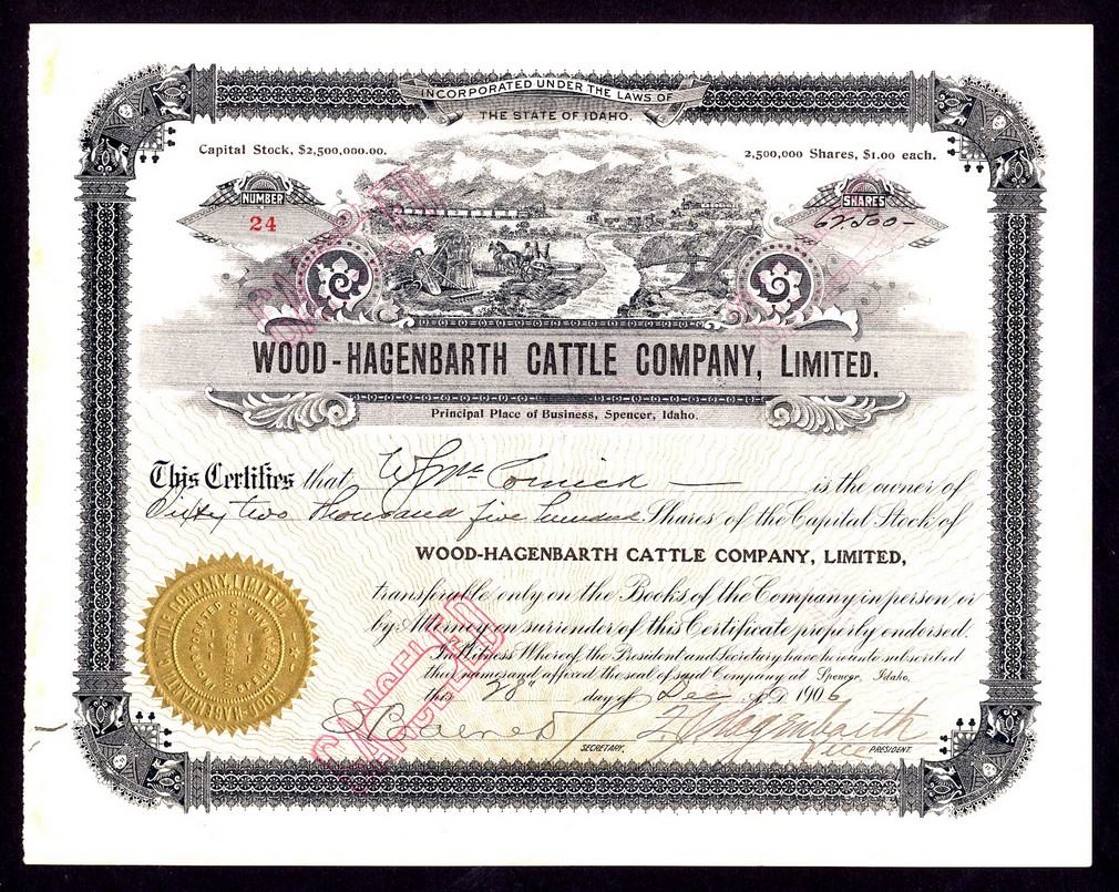 Wood-Hagenbarth Cattle Co. Ltd. (ID), $1 shares, Spencer, Idaho 190[6], #24, cattle and farming scene with steam trains in background, black, gold underprint and seal, stamped cancelled, glue residue left edge, gvf