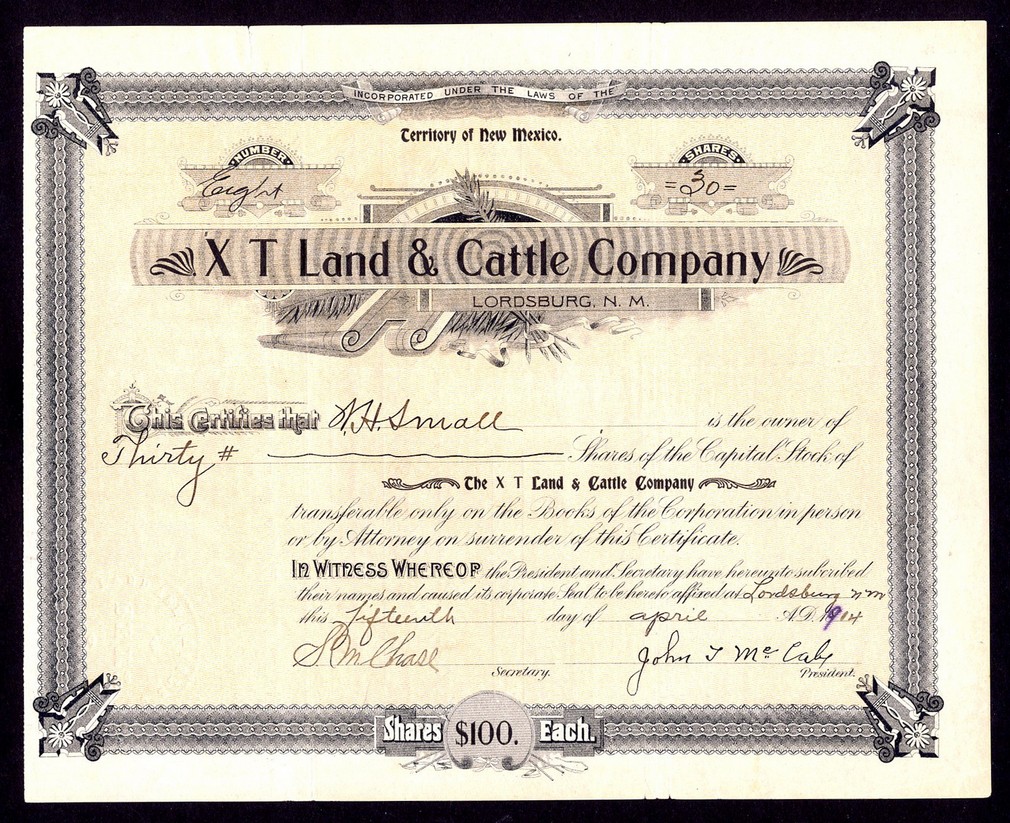 X T Land & Cattle Co. (NM), $100 shares, Lordsburg 18[914], #8, ornate border, black, yellow underprint, gvf.
