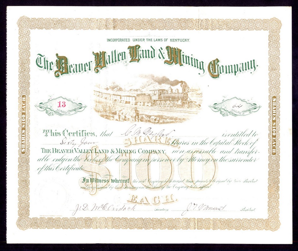 Beaver Valley Land & Mining Co. (KY) $100 shares, fully issued but undated by circa 1880, #13, lovely vignette of steam train carrying coal passing through industrial scene, ornate border, gold and green, printed by The Krebs Lithographing Co., uncancelled, GVF.