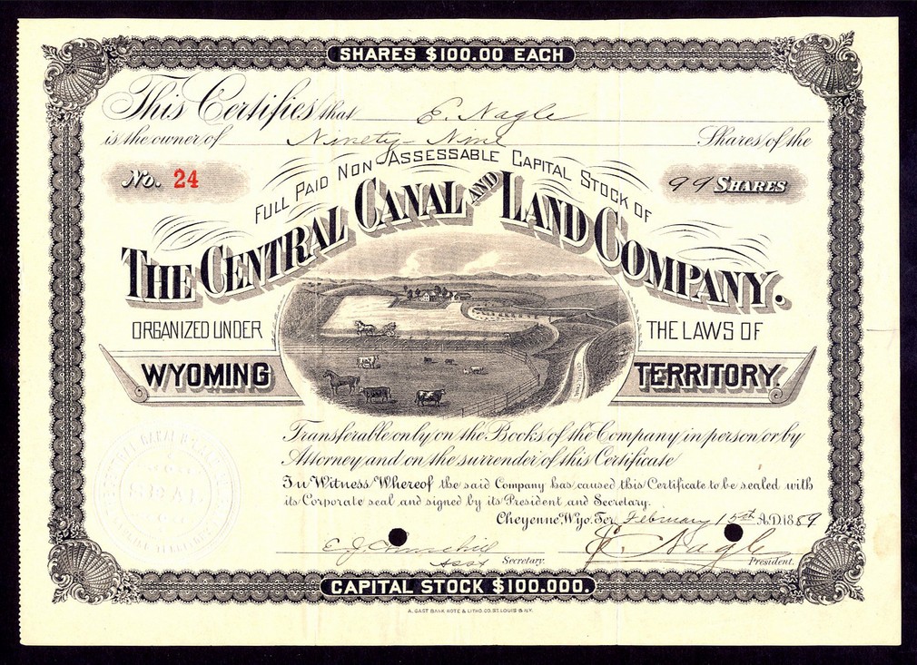 Central Canal and Land Co. (WY), $100 shares, Wyoming 18[89], #24 lovely vignette of pastoral scene beside the Central Canal, ornate border, printed by A Gast, black, punch cancelled, GVF.