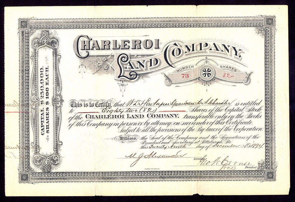Charleroi Land Co. (PA), $100 shares, Pittsburgh, [1894], #73, ornate border at left, printed by Otto Krebs, black, small edge nicks, VF.