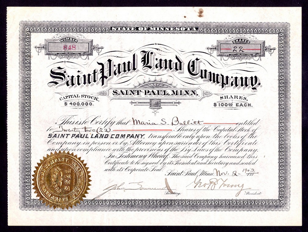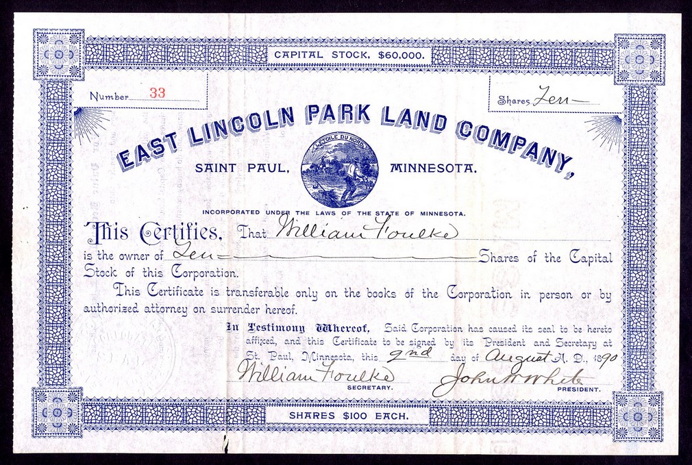 East Lincoln Park Land Co. (MN), $100 shares, St. Paul 18[90], #33, small vignette of native American confronting farmer with state motto L'Etoile du Nord at top, ornate border, blue, together with 3 more Minnesota land companies comprising; St. Louis Land Improvement Co., $100 shares, Duluth 18[91], #364, 3 small vignettes; farmer at left, coat of arms at right, beehive at bottom, ornate border, gold seal, green, Saint Paul Land Co., $100 shares, 188[903], #848, ornate border gold seal, black, Union Land Co. of Saint Paul, $100 shares, 188[7], ornate border, gold seal, black on green, all uncancelled, the first with small edge nicks, VF (4)