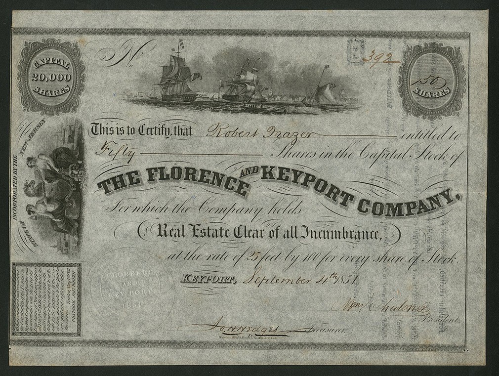 Florence and Keyport Company., 50 shares in real estate company "at the rate of 25 feet by 100 for every share of stock", Keyport 1851, vignette of sailing ships top and coat of arms of New Jersey left hand side, black, left edge close cut otherwise EF.