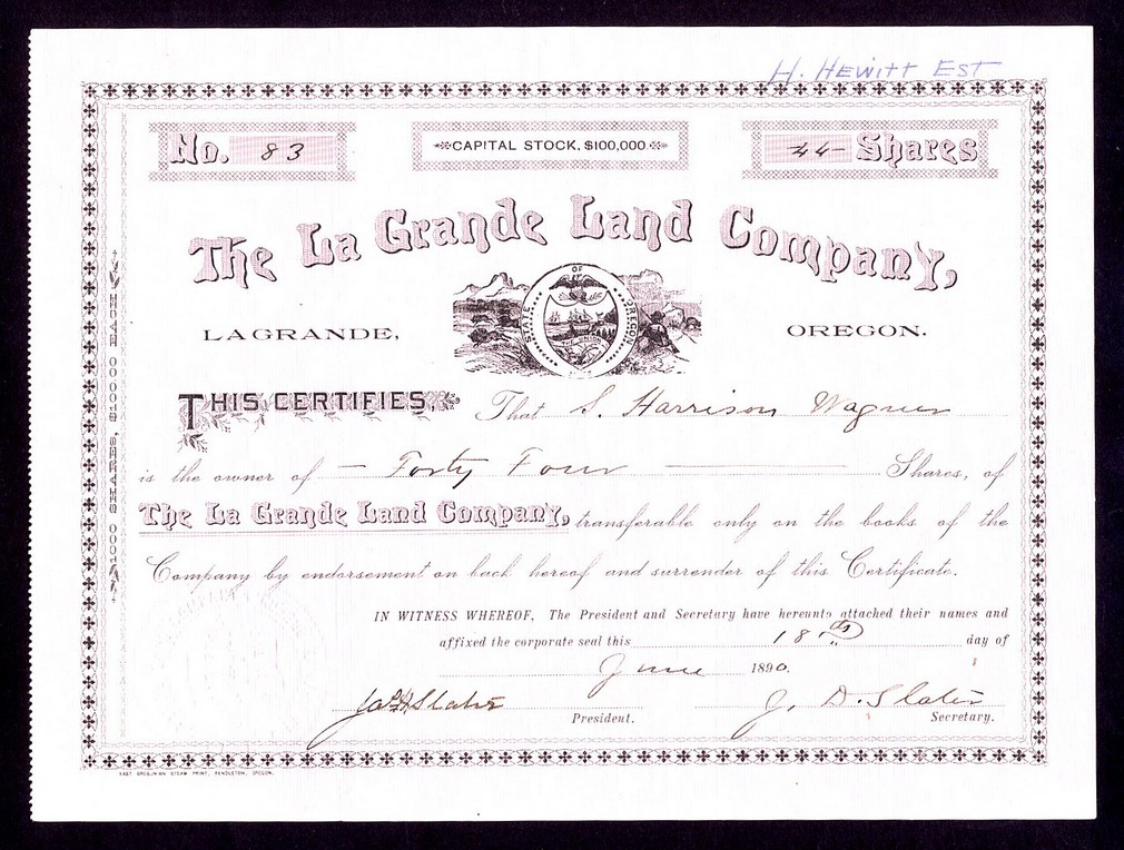 La Grande Land Co. (OR), $100 shares, 189[0], #83, small vignette at top with Oregon State emblem at centre flanked by buffalo at left and cowboy at right, ornate border, printed by East Oregonian Steam Print, black on pink underprint, AEF.