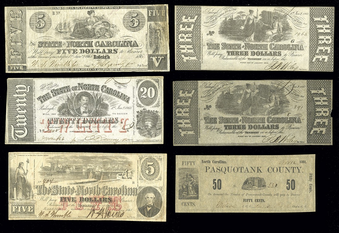 A Selection of North Carolina Notes. State of North Carolina 1) $5. 1862. Cr.85. Fine. 2) $20. 1863. Cr.119. VF. 3) $5. 1863. Cr.123. VF. 4) $3 1863. Cr.125. AU. 5) Similar, but contemporary counterfeit. AU, with a small piece out of the right margin. 6) Pasquotank County. 50 Cents. 1861. Hebe and eagle, left. VF-EF. [6]