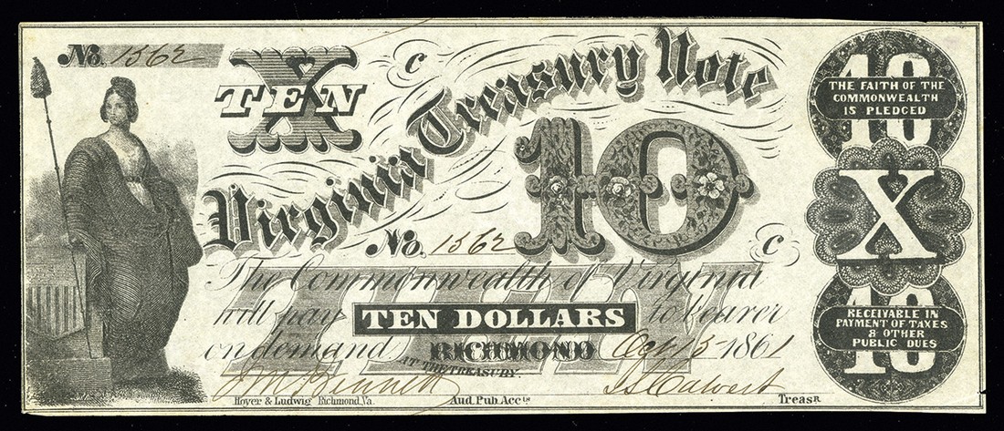 VA. Virginia Treasury Note. $10. 1861. Cr.4. Liberty, pole and cap. PCGS Choice About New 55. Small corner fold and edge nick, lower right.