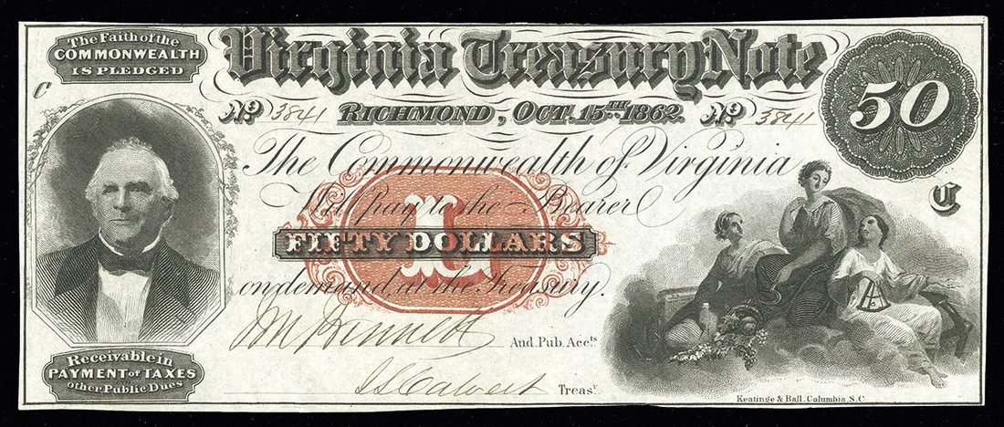 VA. Virginia Treasury Note. $50. 1862. Cr.7A. Red protector. Governor Mason. AU-Unc, with natural paper wrinkles. Trimmed close at the top, and there are a few pinholes.