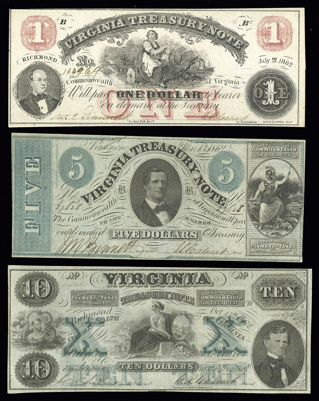 Virginia Treasury Note Trio. 1) $10. 1862. Cr.8. VF, but with a neatly repaired small hole near the center. 2) $5. 1862. Cr.13. EF-AU. 3) $1. July 21, 1861. Cr.17. CU. [3]