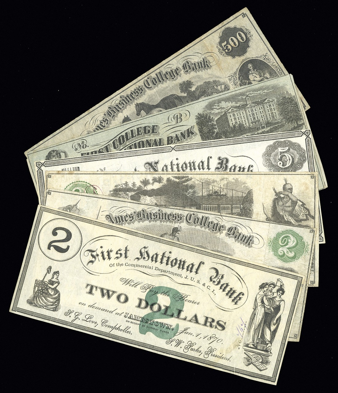 NY. College Currency Assortment. 1) Syracuse. Ames' Business College. $2. Green. NY-2575-2. VF. 2) $3. Green. NY-2575-3. VF. 3) $500. Similar to NY-2575-500 but uniface. VF. 4) Claverack. First College National Bank. $10. Green. NY-600-10.A. VF. 5) Jamestown. First National Bank of the Commercial Department J. U. S. & C. I. $2. Green. NY-900-2. EF. 6) $5. Green. NY-900-5. EF. 7) $10. Green. NY-900-10. F-VF. [7]