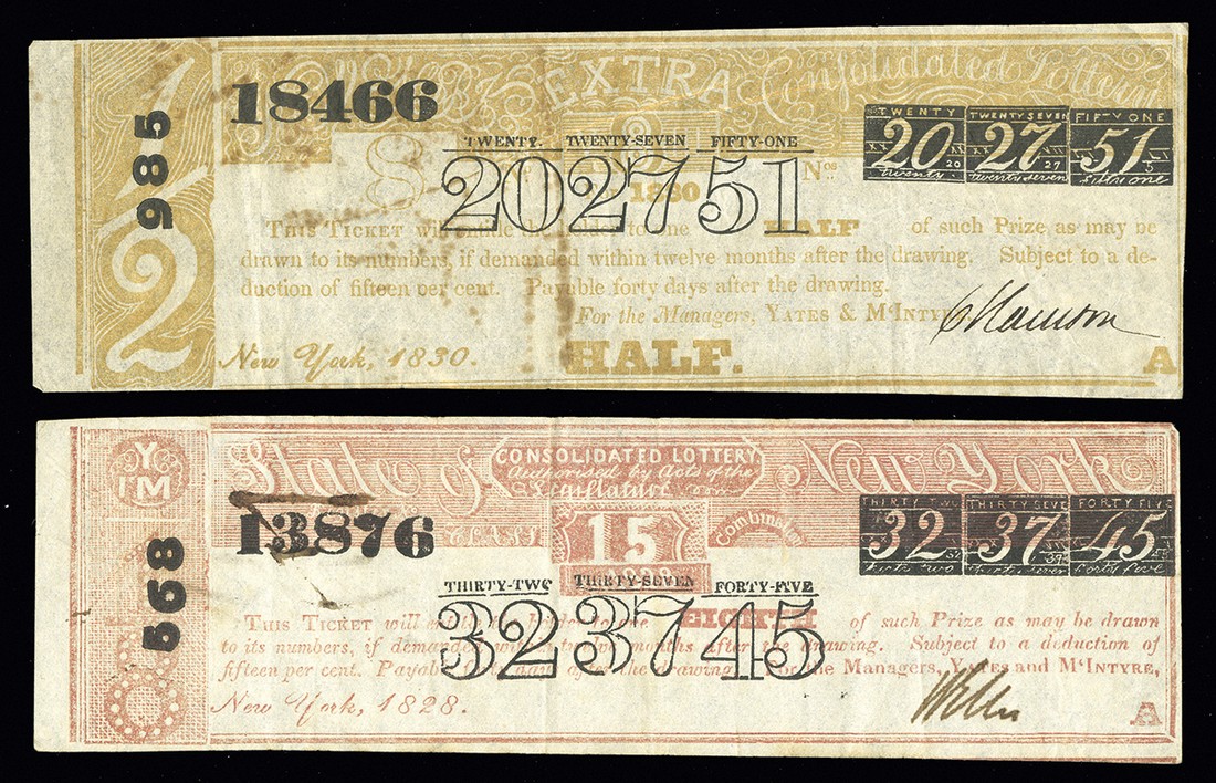 New York Lottery Tickets. Yates & McIntyre. Consolidated Lottery. 1) 1828. Red. 15 in red underprint. 32 37 54. VF. 2) 1830. Orange. 1/2 in left end panel. 20 27 51. Fine, some staining. [2]