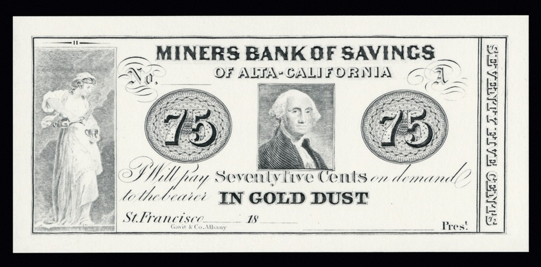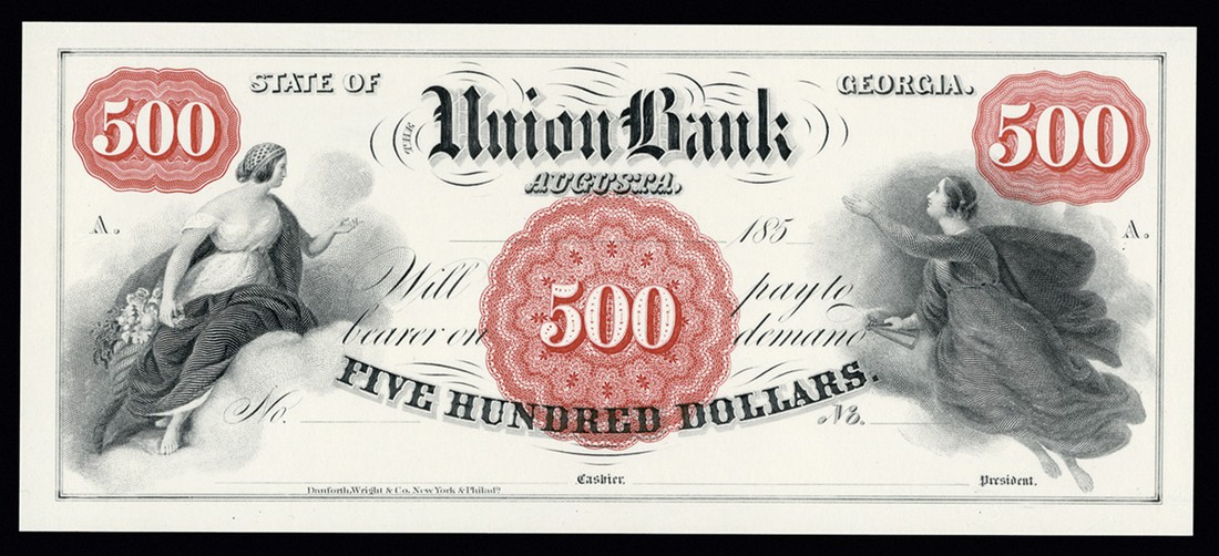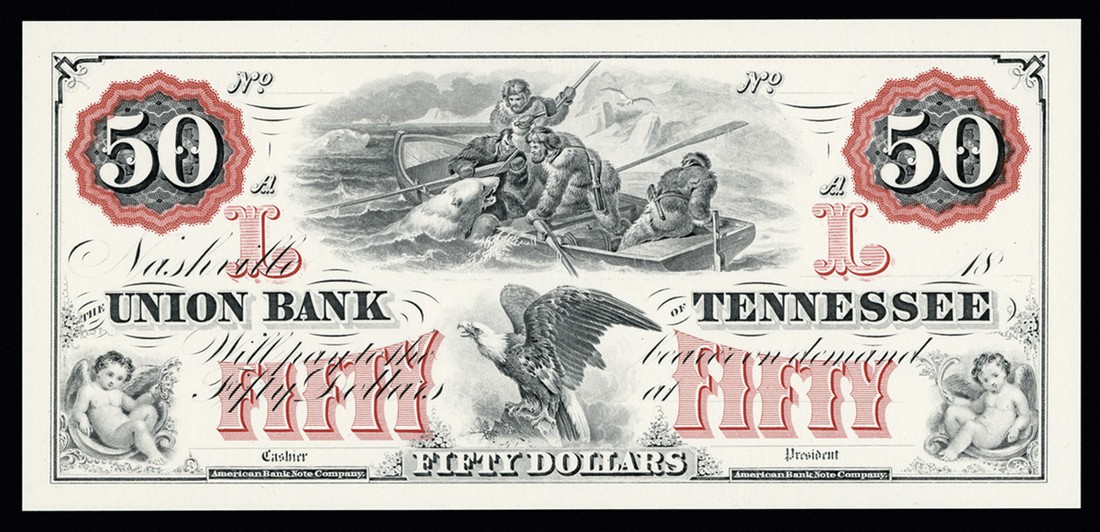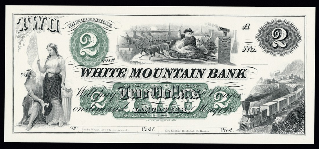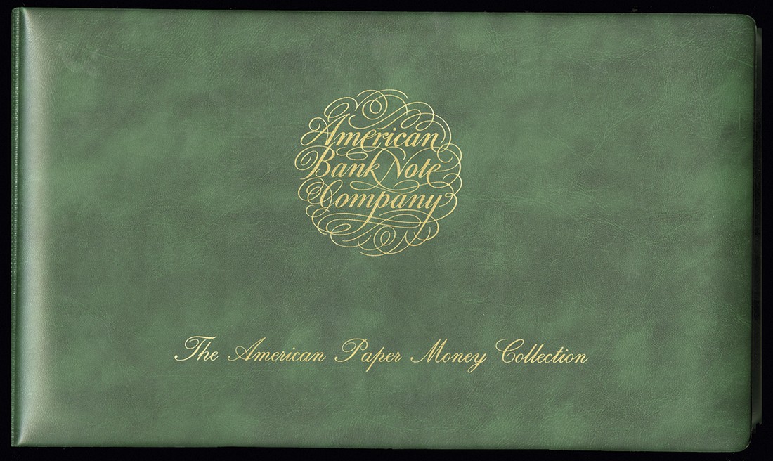 "The American Paper Money Collection." 1995. Green simulated leather binder with thirty-six different obsolete bank notes from thrity-six different states. Each obsolete note is meticulously printed from the original plates on heavy paper, and lightly mounted on deluxe "Premier Edition" binder pages. Some of the highlights are a $2 Santa Claus note from the White Mountain Bank, Lancster, NH; a spectacular $500 Union Bank, Augusta, GA; a polar bear note from the Union Bank of Nashville, Tennessee; and a Miners Bank of Savings gold dust note from San Francisco, CA.