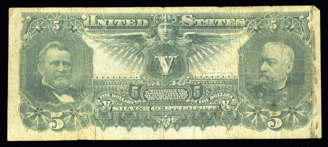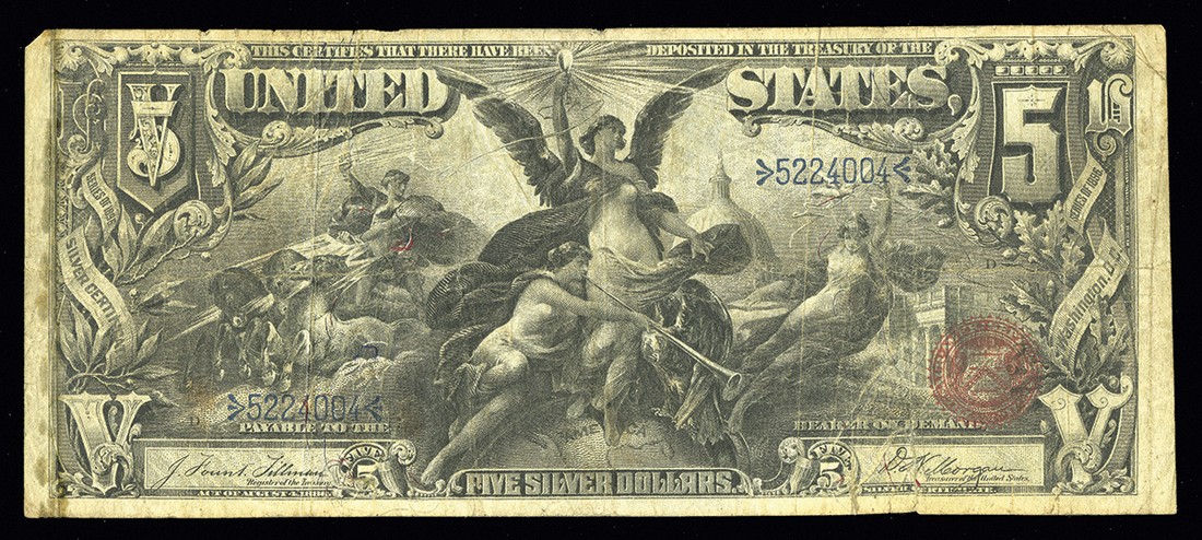Fr.268. $5. Silver Certificate. 1896. No.N5224004. Educational. Fine detail, but there are some translucent oil stains near the left border, and a few small edge splits that have been repaired. Minor age toning spots are also present. Still a very presentable circulated example of this popular note.