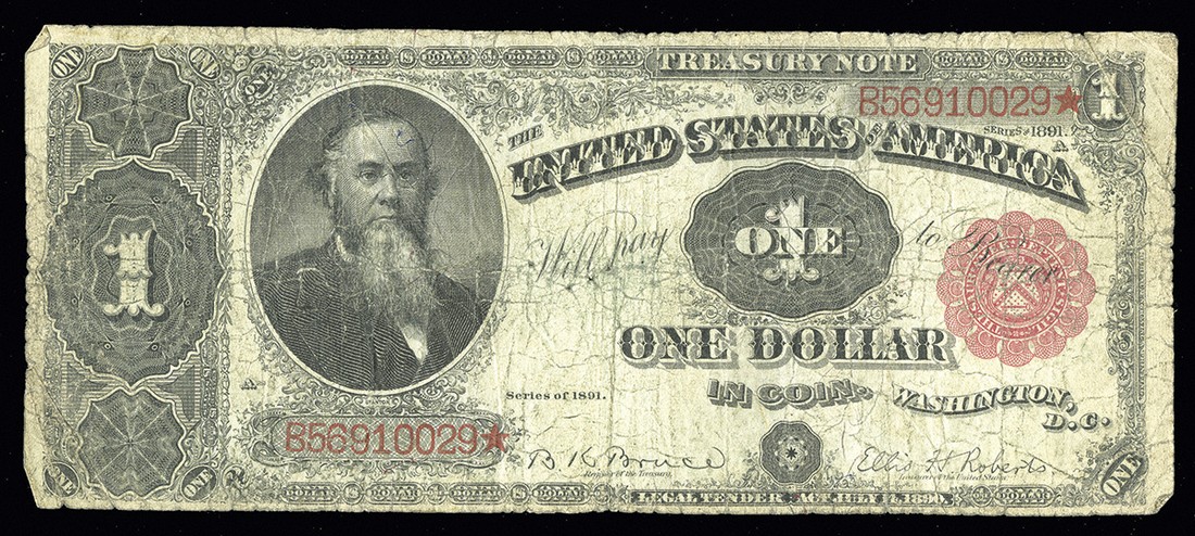 Fr.352. $1. Treasury Note 1891. Stanton. About Fine details, but there are numerous pinholes near the center.