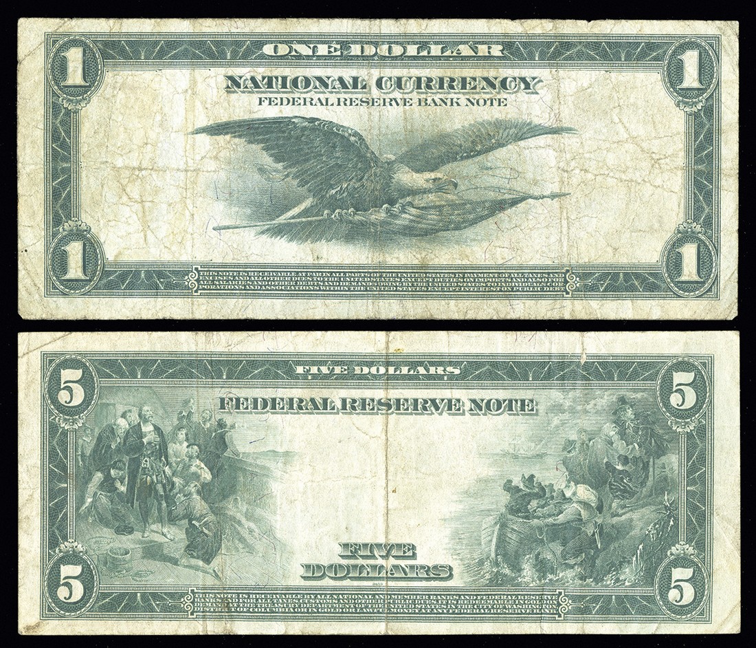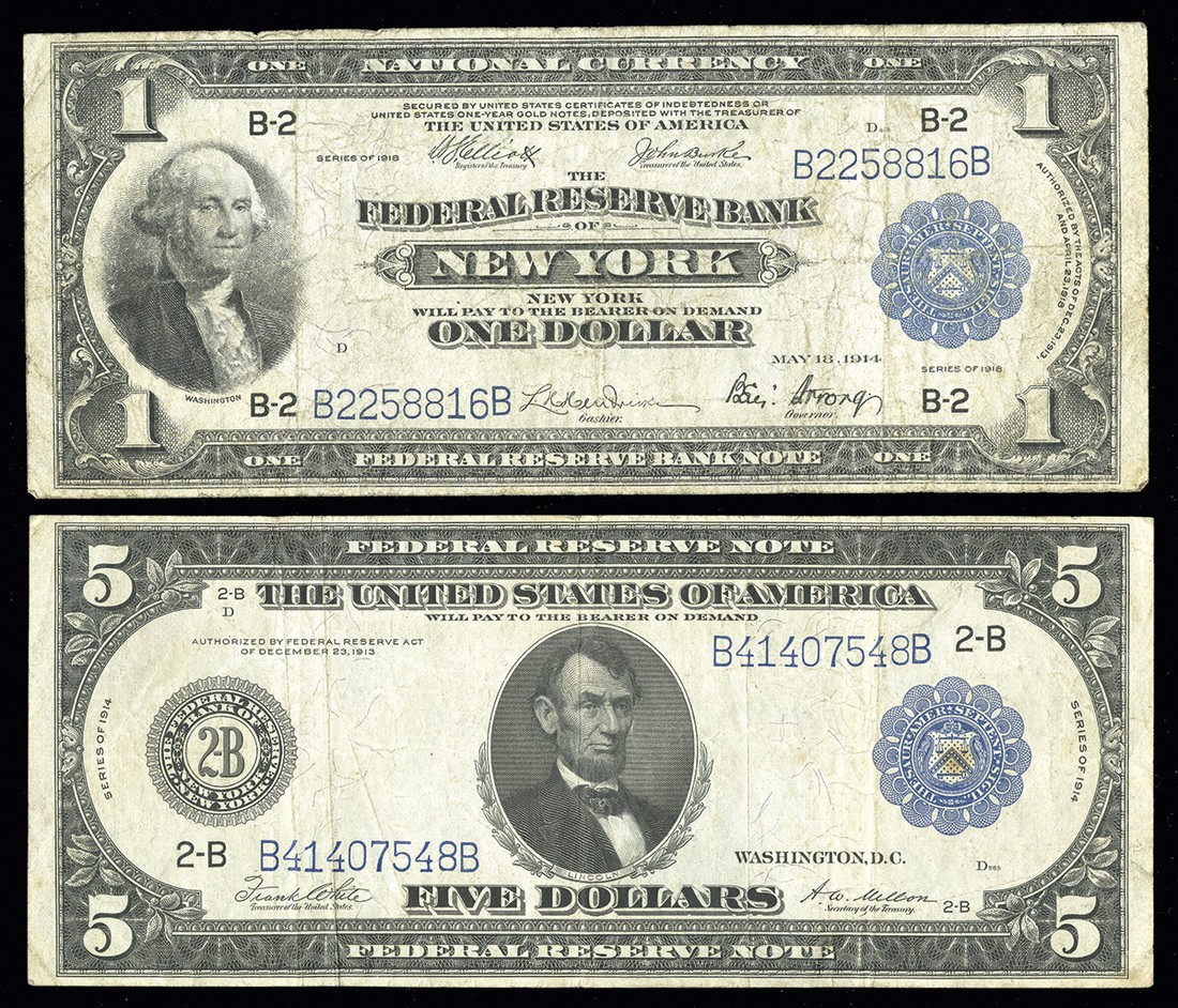 New York Federal Reserve Duo. 1) Fr.713. $1. FRBN. 1918. Fine. 2) Fr.851A. $5. FRN. 1914. VF. [2]