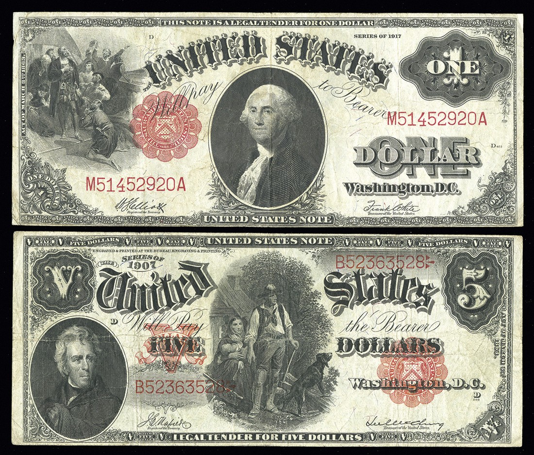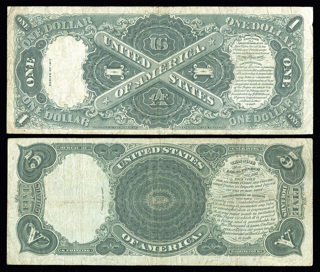 Large Size Legal Tender Duo. 1) Fr.38. $1. 1917. Fine. 2) Fr.85. $5. 1907. Fine, pinhole. [2]