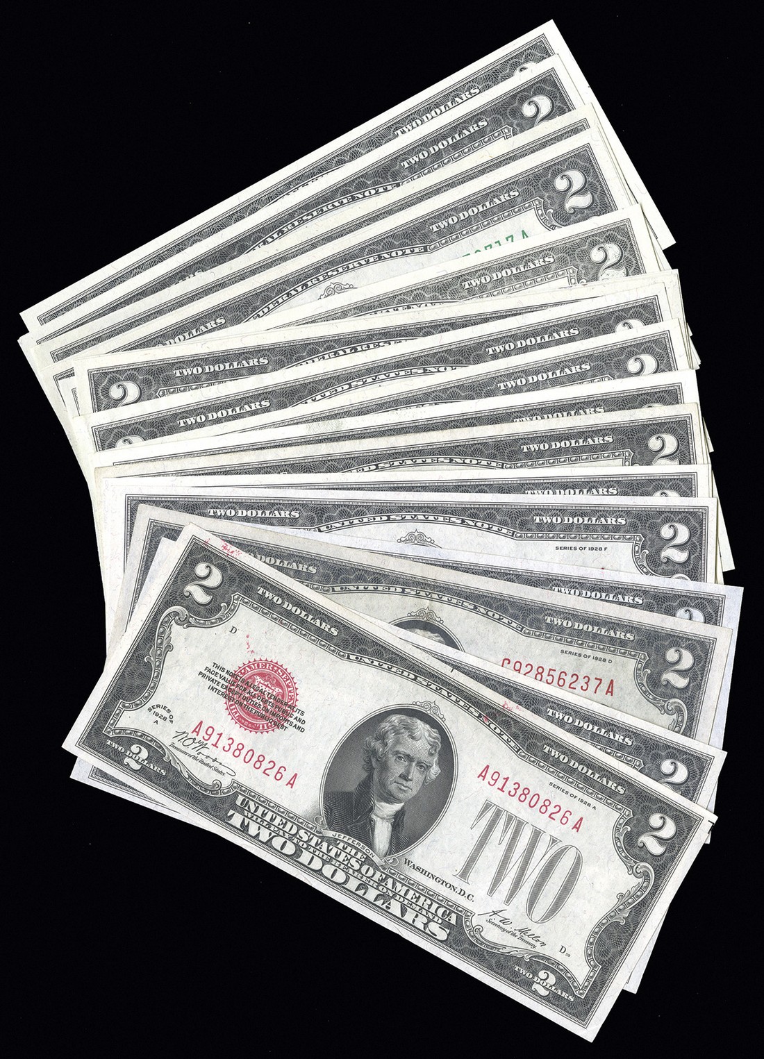 Nice Selection of Small Size $2 Notes. 1928A LT AU, minor stains; 1928C LT EF; 1928D LT EF-AU; 1928E LT Unc; 1928F LT Unc; 1928G LT Choice Unc; 1953 LT Choice Unc; 1953A LT AU; 1953C LT Unc; 1953B* LT Unc; 1963 LT Choice AU; 1963A LT VF-EF; 12-Piece 1976 FRN District Set Unc; 1995 FRN Unc. [25]