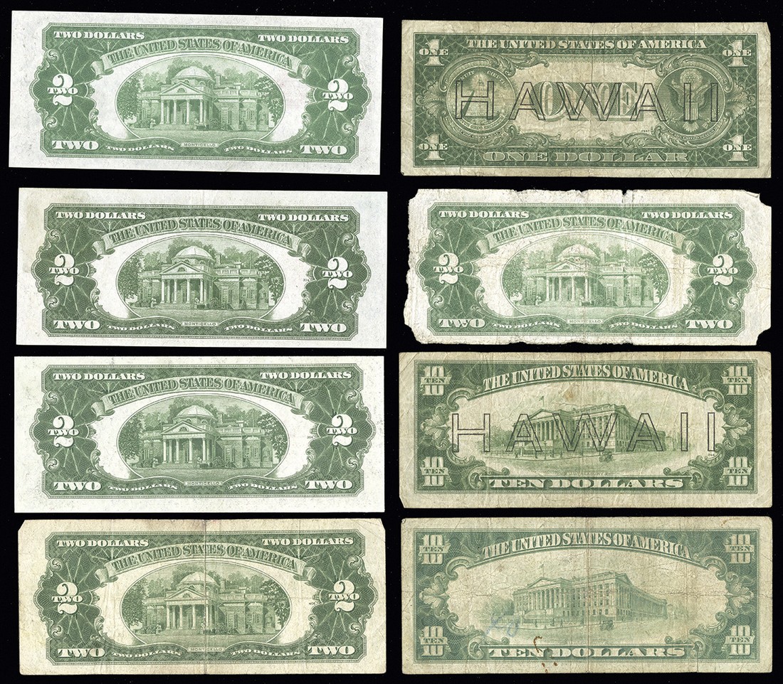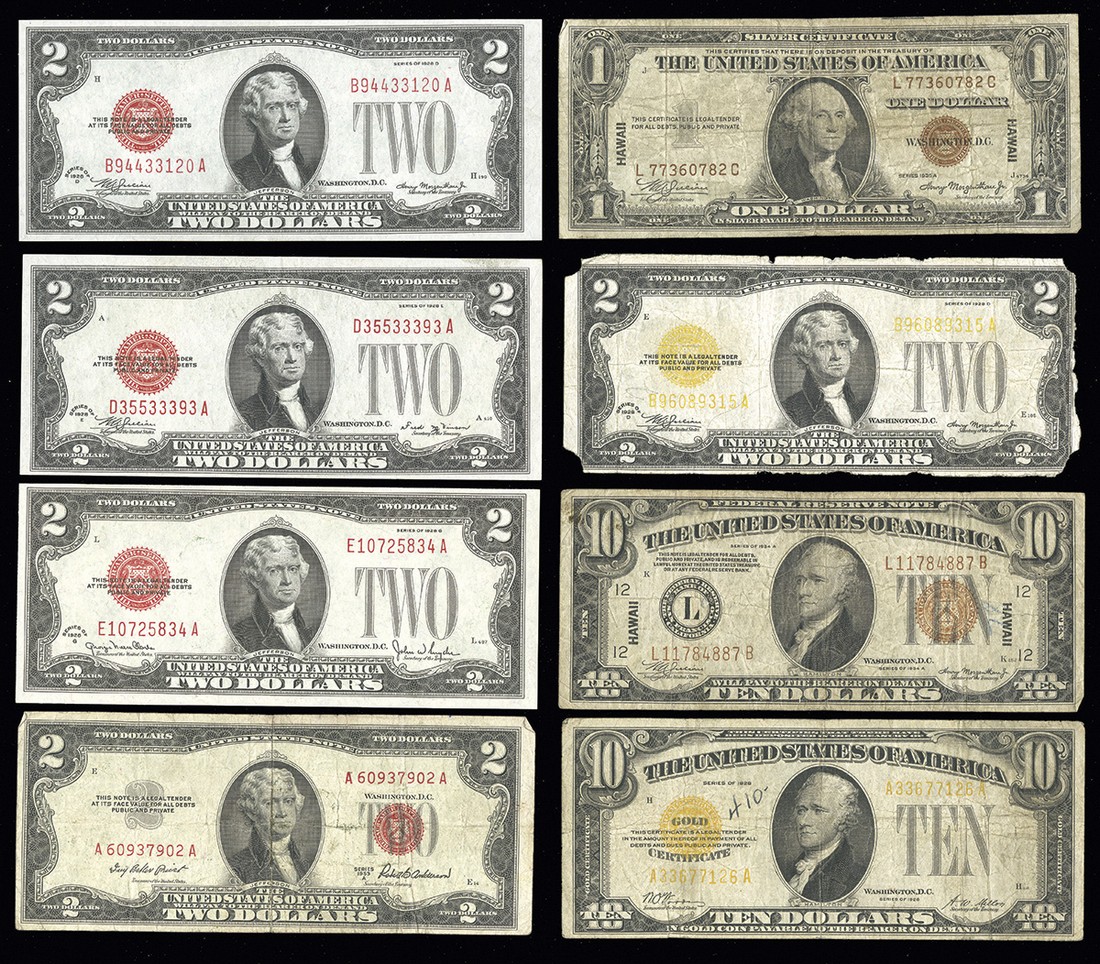 Small Size Federal Assortment. 1-5) $2 Legal Tenders 1928 E VF-EF; 1928D(2) Fair, bleached; EF-AU; 1928G EF-AU; 1953A About Fine. 6) $1 Silver Certificate 1935A HAWAII Fine. 7) $10 Silver Certificate 1935A HAWAII Fine. 8) $10 Gold Certificate 1928. Fine details, penned "410" on front, paper clip rust stain, back. [8]