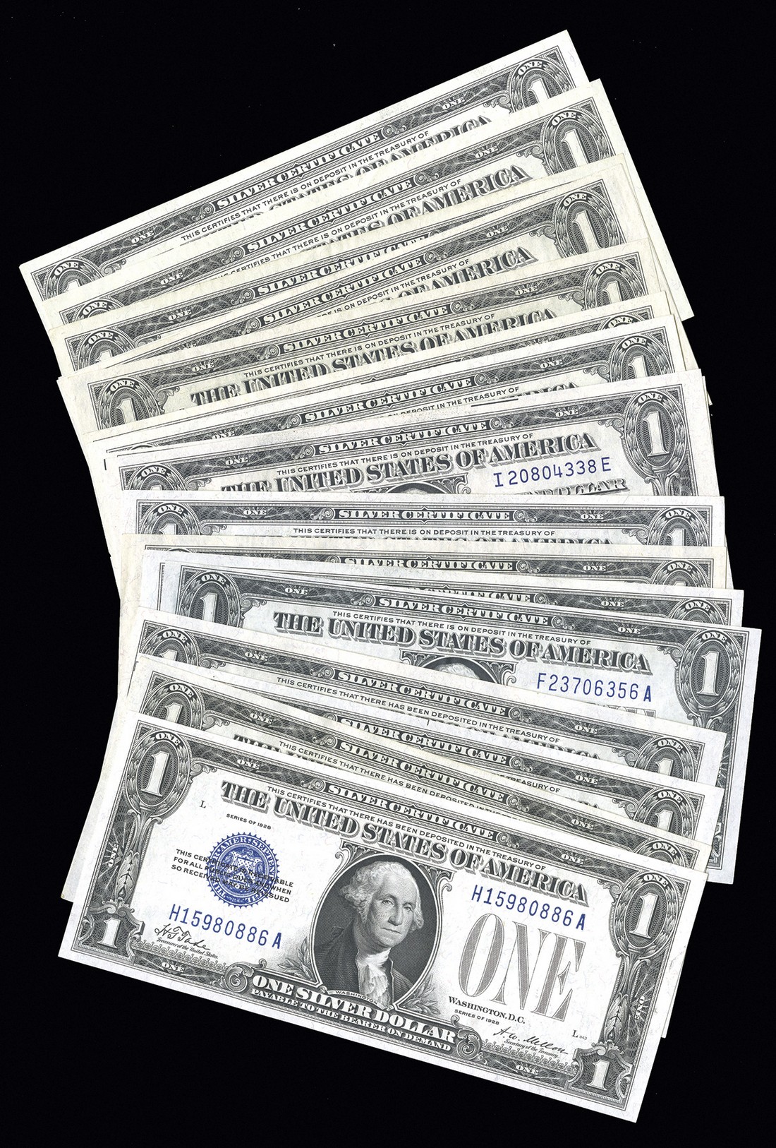 Small Size $1 Silver Certificate Assortment. 1928 Choice CU; 1928A EF-AU; 1928B Choice CU; 1928D EF; 1934 AU; 1935 Unc; 1935A Unc; 1935B Unc; 1935C Unc; 1935D Unc; 1935E* Unc; 1935F Unc; 1935G No Motto VF; 1935G Motto Unc; 1935H Unc; 1957 VF; 1957A Unc; 1957B EF-AU. [18]
