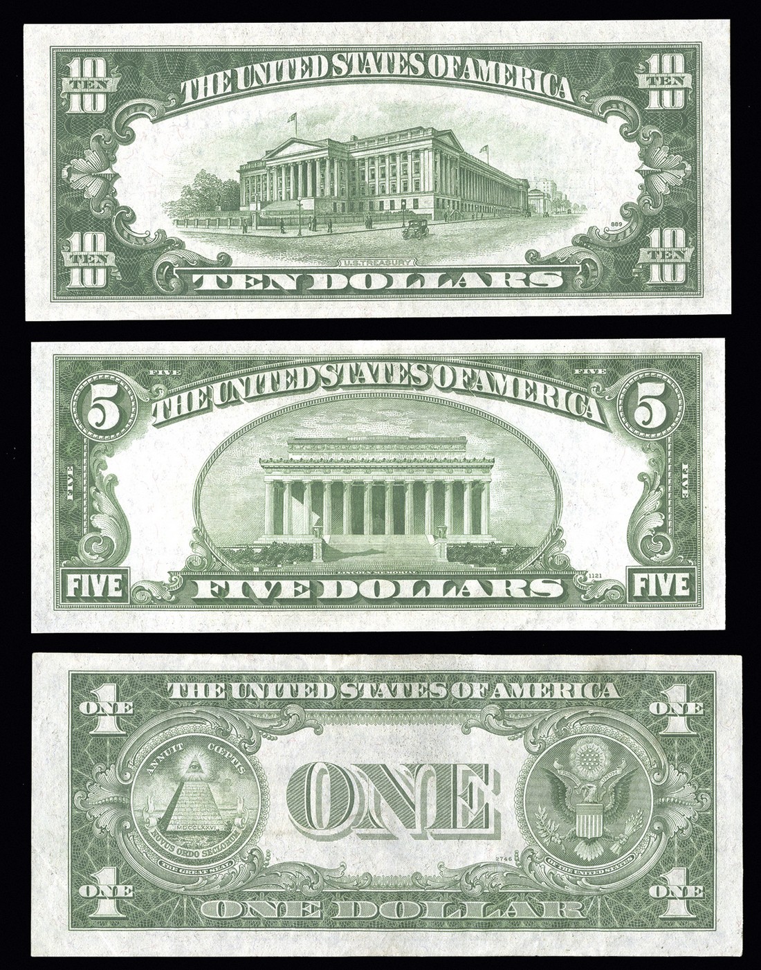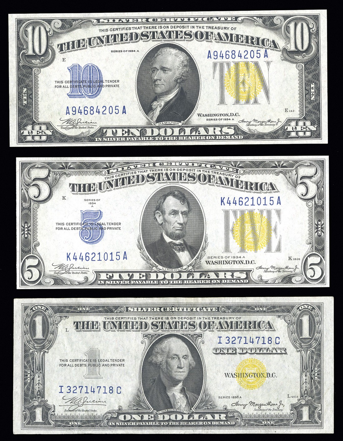 World War II Emergency Issues - North Africa, Yellow Seals. Fr.2306 $1 SC 1935A EF; Fr. 2307 $5 SC 1934A AU; Fr.2308 $10 FRN 1934A Choice Unc. [3]