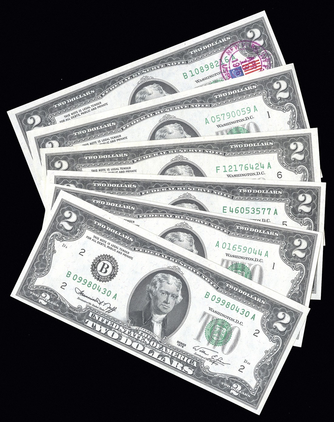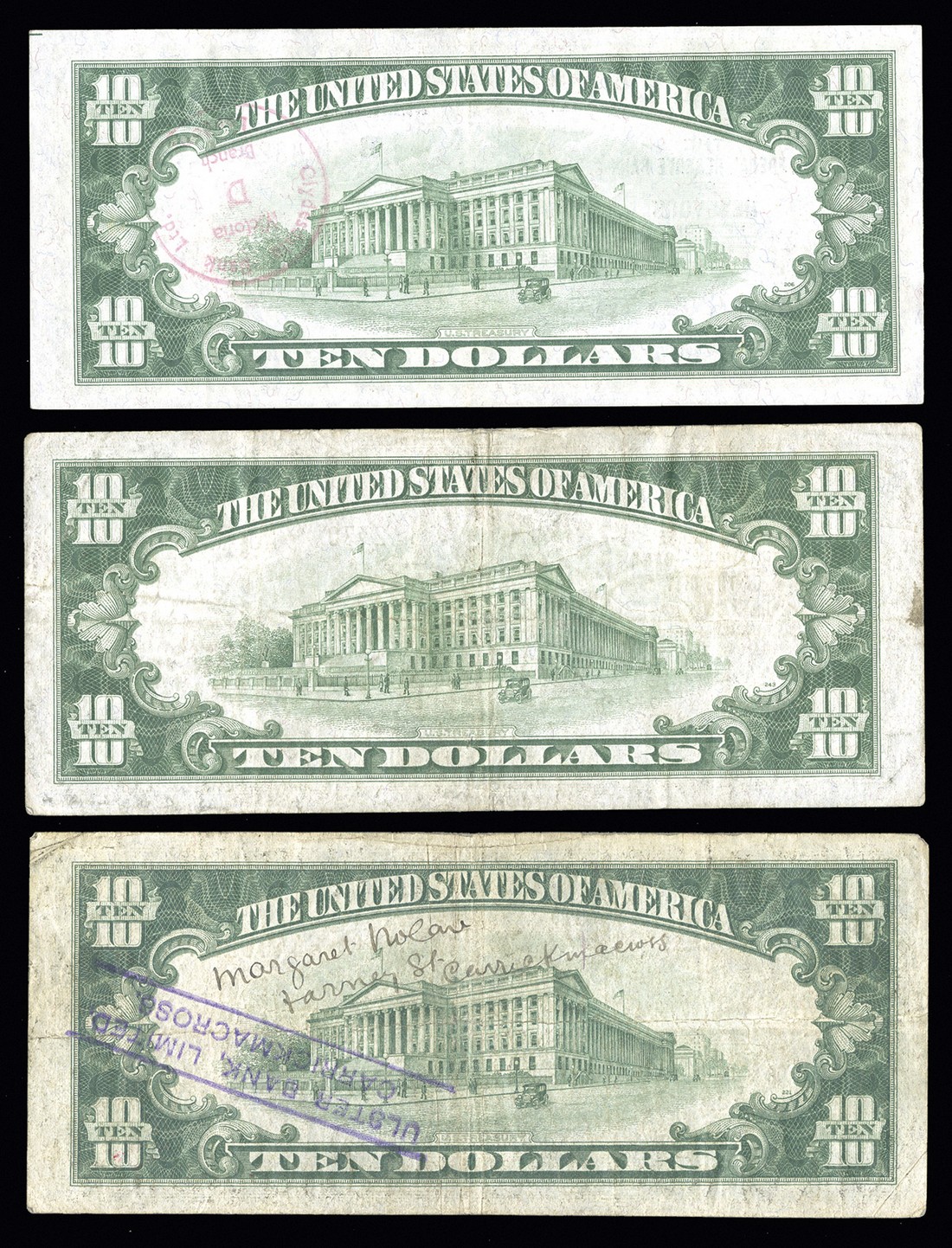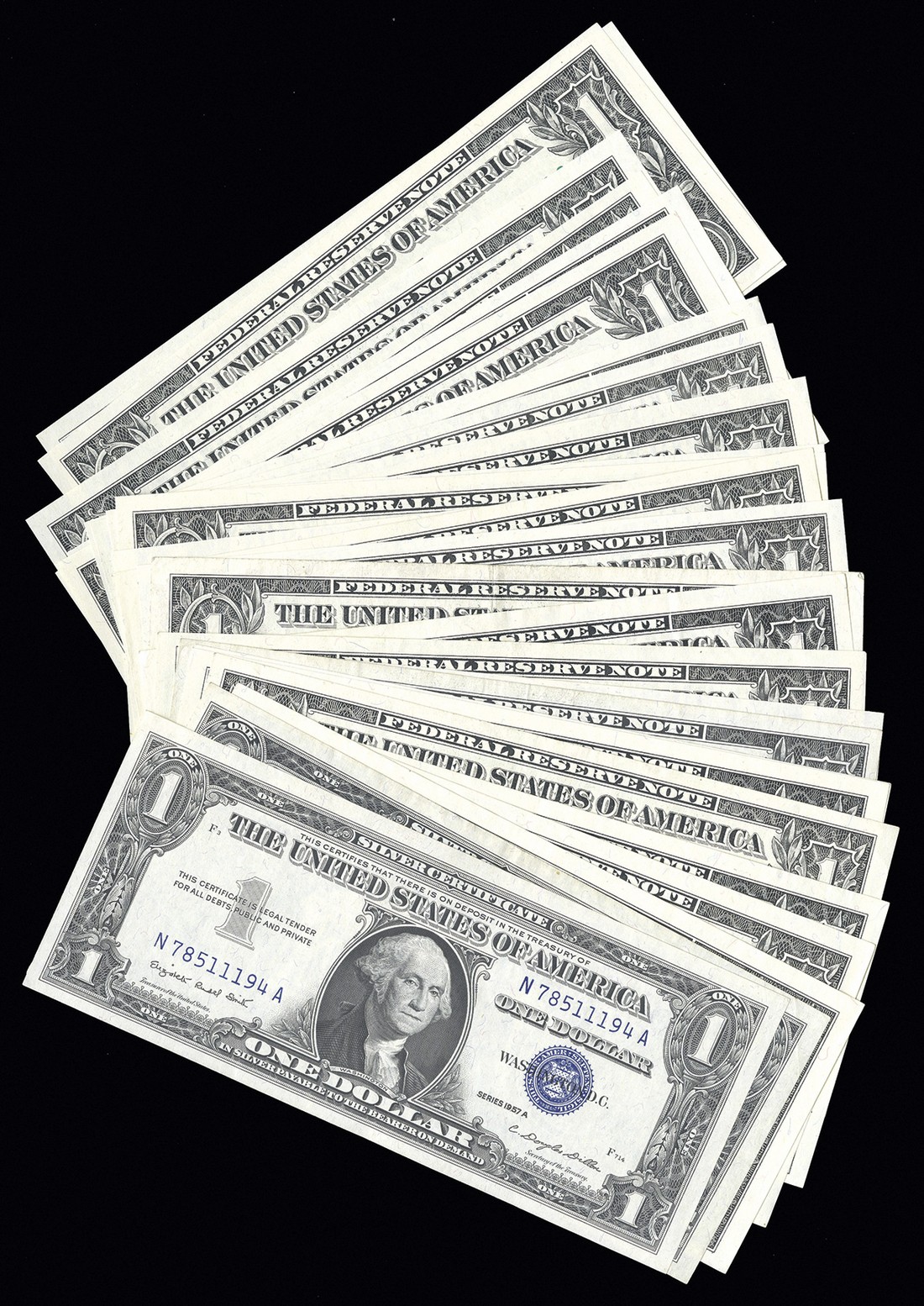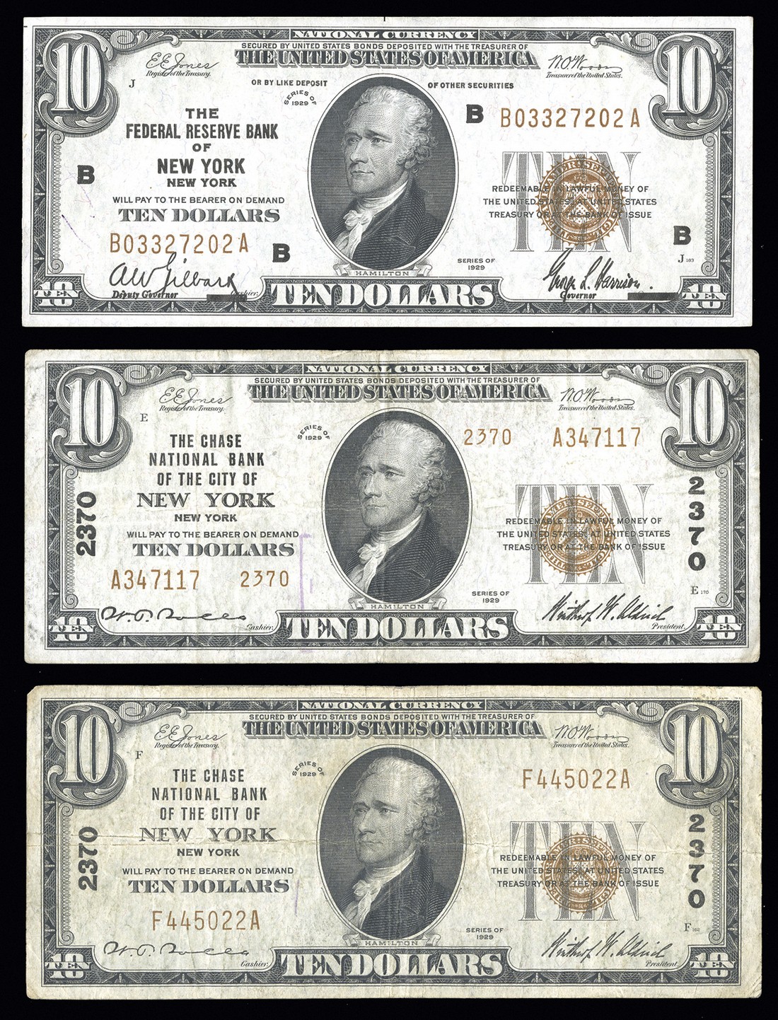 U. S. Paper Money Assortment. 1) 15 Cent Fractional Specimen Fr.1272S. Fine detail, trimmed into the borders, and there are mounting remnants and stains on the back. 2-28) Assorted $1 FRNs including a district set of 1988A, and a 1957A & B. Mostly Unc. 29-34) $2 1976 FRNs including two first day covers. 35) $10 1929 FRBN EF detail, teller's stamp on back. 36-37) $20 1929 FRBNs. NY. Both VF. 38-39) $10 Chase National Bank of the City of NY. Both F-VF, but one with teller's stamp and writing on back. Face value = $107. [39]