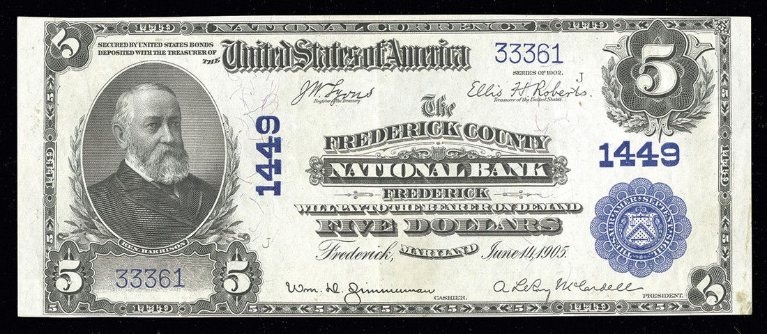 MD. Frederick. Ch.1449. Frederick County National Bank. $5. 1902 PB. Fr. 598. No.33361. Plate J. EF.