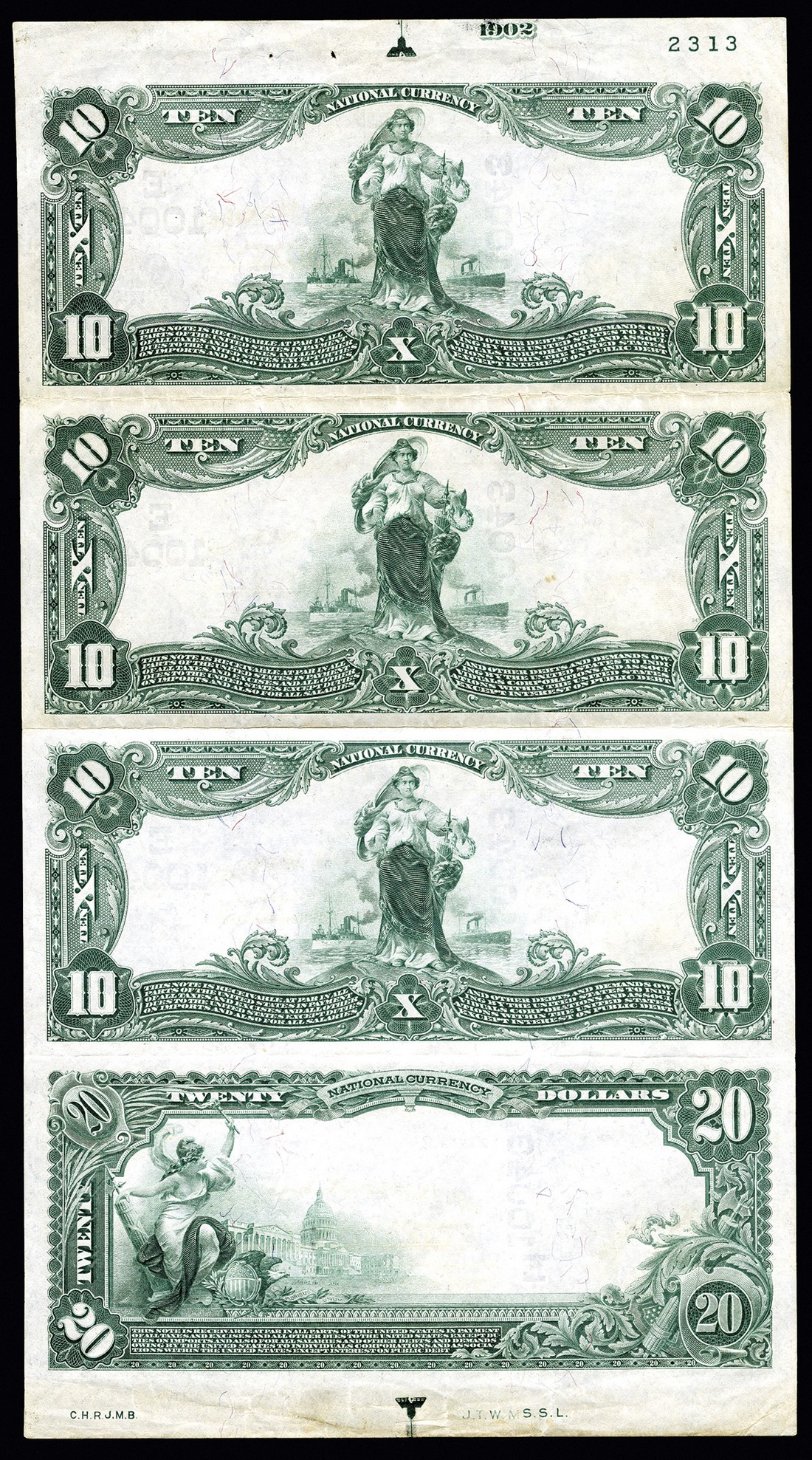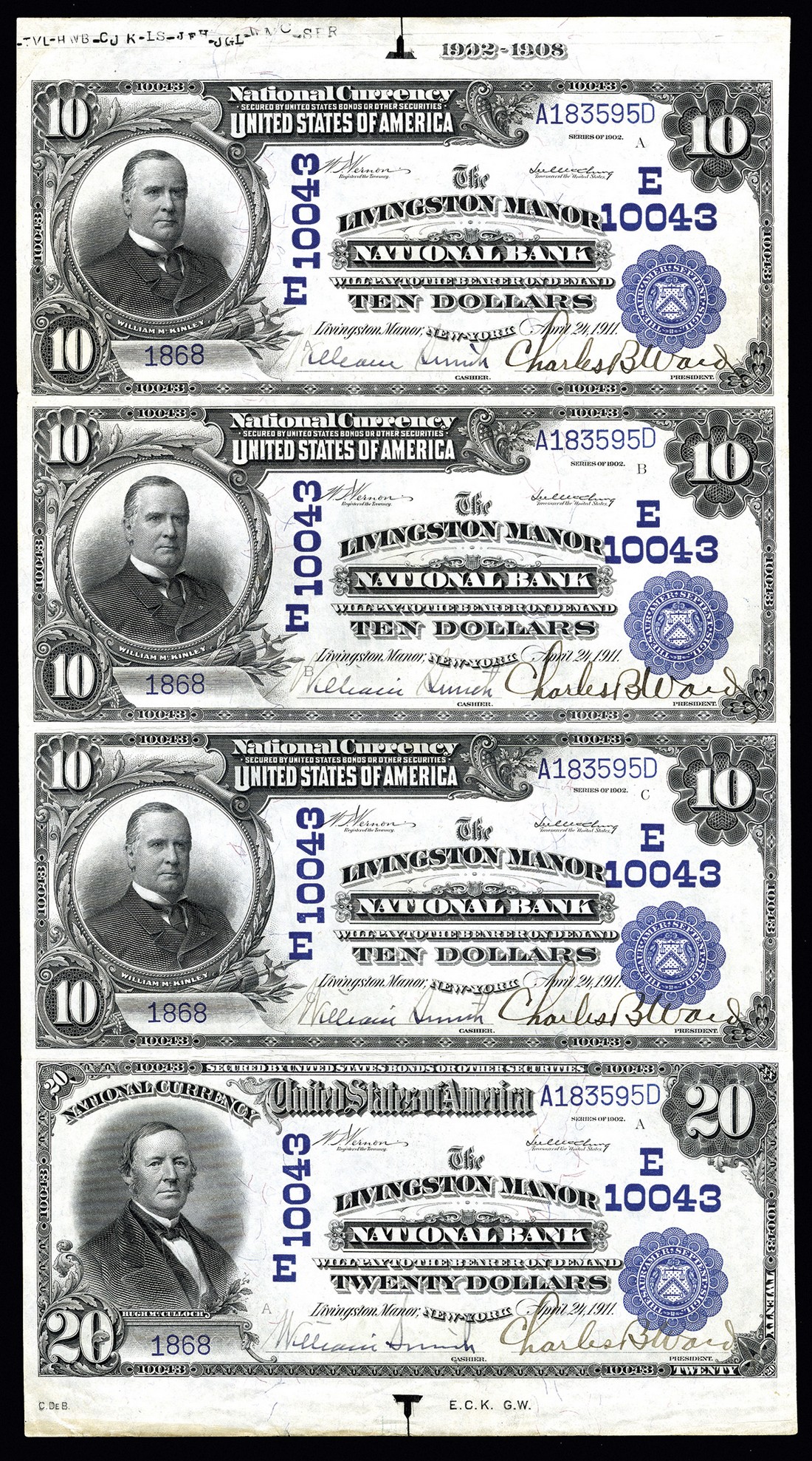 NY. Livingston Manor. Ch.10043. Livingston Manor National Bank. $10-10-10-20. Uncut sheet. 1902 Plain Backs. Fr. 627-627-627-653. No.A183595D / 1868. Plates ABCA. On the front, in the wide top margin, "1902-1908," numerous BEP plate engraver's initials, and a registration mark are printed; at the bottom, similar initials and a registration mark appear. On the back, in the wide top margin "1902, " and "2313" are present along with a registration mark; in the bottom margin "J. H. R. M. B.," "J. T. W. M. S. S. L.," and a registration mark appear.