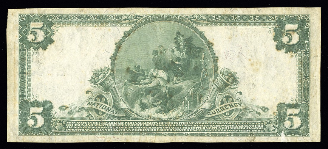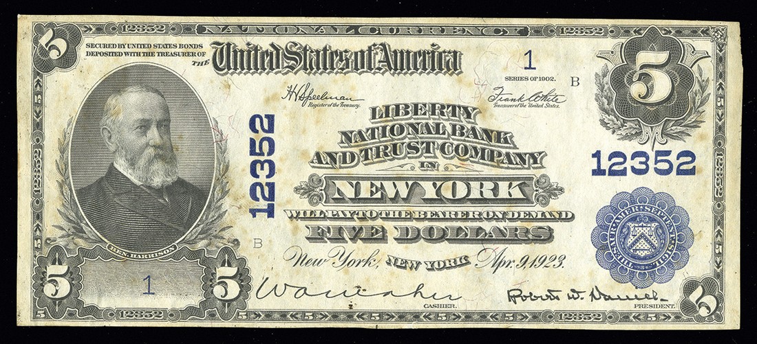 NY. New York. Ch.12352. Liberty National Bank & Trust Company in New York. $5. 1902 PB. Fr. 609. No.1/1. Plate B. Almost Uncirculated, with light teller handling, an uneven right margin, and light age toning on both sides. Perhaps the nicest large size National in the census, and the only Serial Number 1 reported on the bank