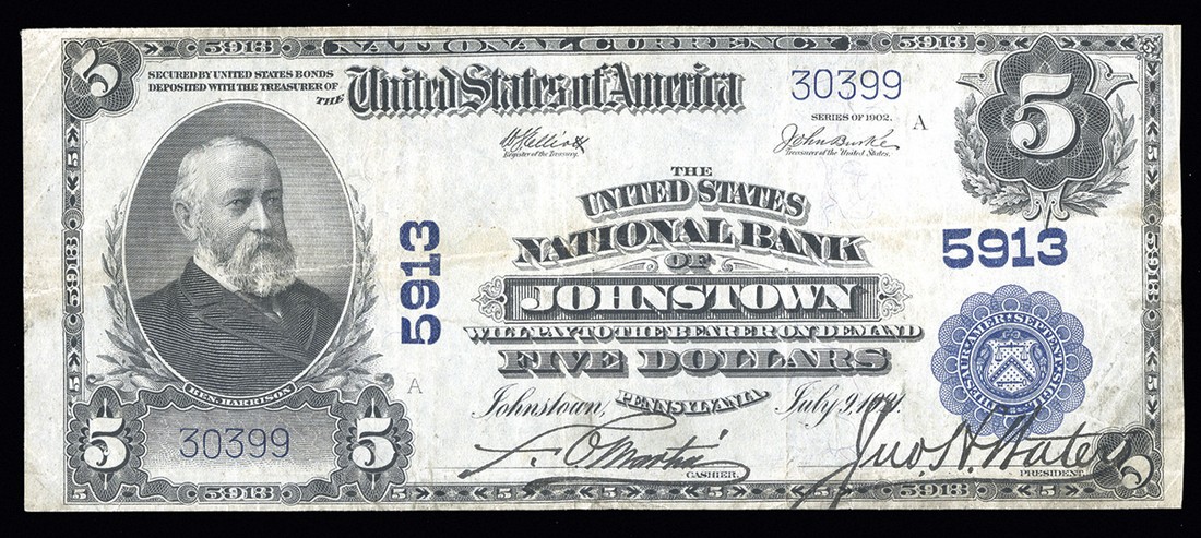 PA. Johnstown. Ch.5913. United States National Bank of Johnstown. $5. 1902 PB. Fr.607. No.30399. Nice "forbidden" title. VF.