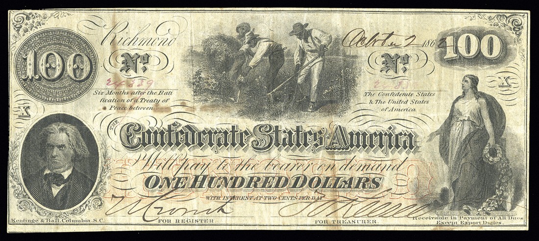 CSA. T-41. $100. Oct. 2, 1862. PF-6. No.24339. X. F-VF details. Some moderate stains. "Issued Mar 4 63 / Albert Danner / Capt & AQM" penned on back. Ex Mason.