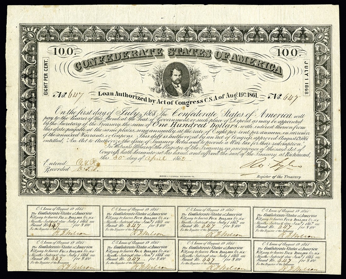 CSA. August 19, 1861. $100. Ball 51. Cr. 28. No.647. Tyler. 8 Coupons. VF+. Margin split at the top.