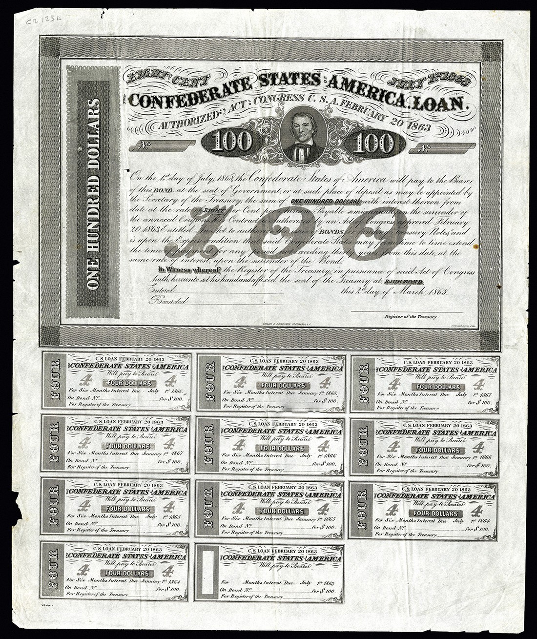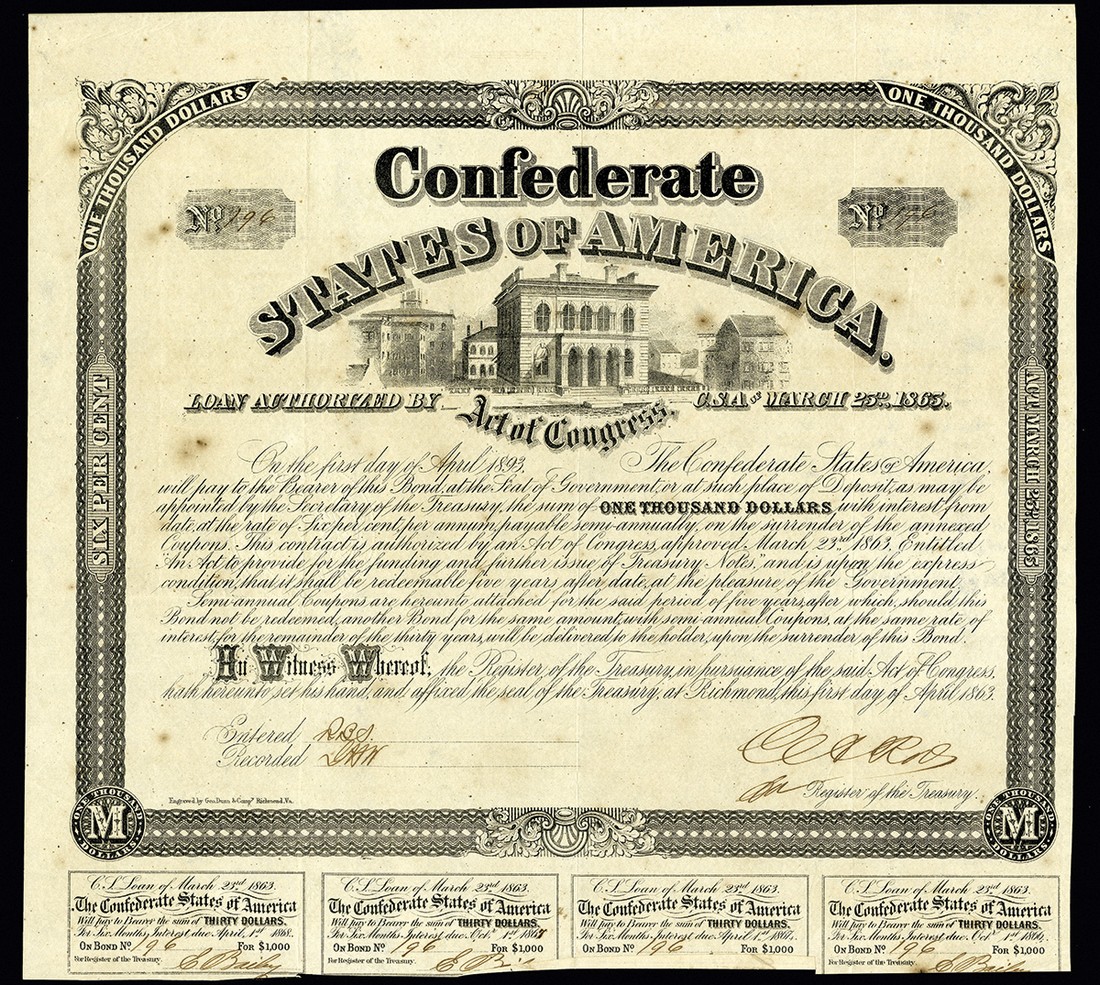 CSA. Bond Pair. 1) $100. Ball 166. Cr. 89. Coupons complete. VF+. With some chips in the margins. 2) $1,000. Ball-263. Cr.130B. VF+. [2]