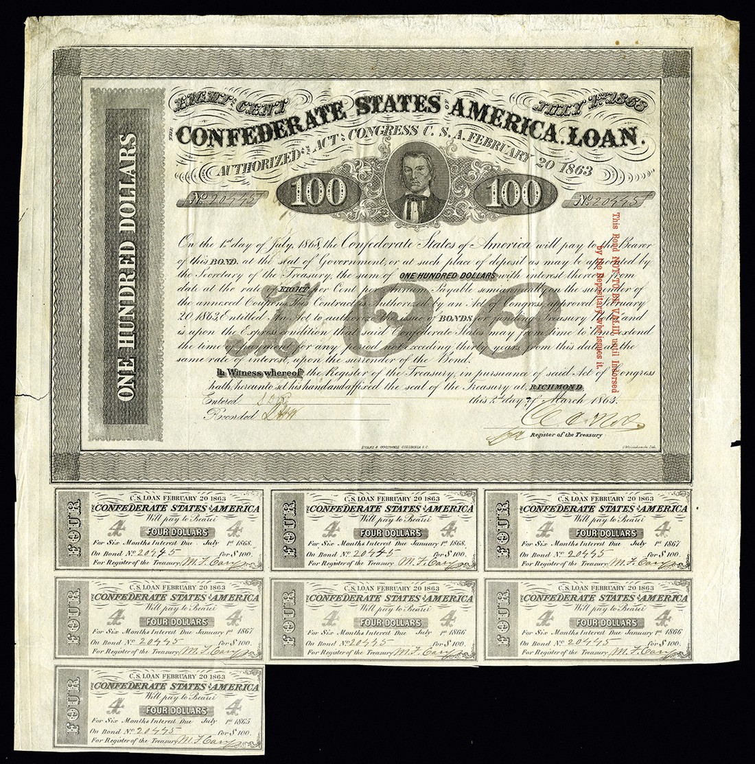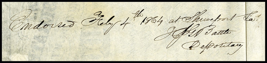CSA. February 20, 1863. $100. Ball 172. No.20445. Alexander H. Stephens. On the front is a red two line overprint. On the back is an endorsement by H. S. G. Battle, CSA Depositary at Shreveport, Louisiana. Rose. 8 coupons. VF-EF. Some light waterstaining confined to the margins, a tiny fold junction hole and some edge splits and chips.