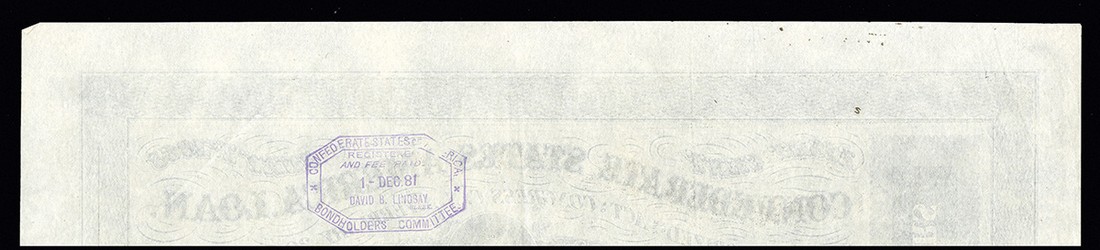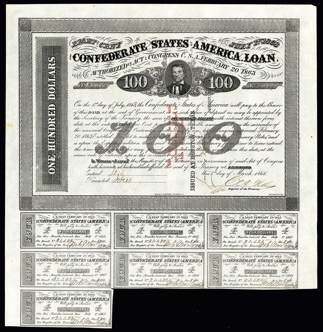 CSA. February 20, 1863. $100. Ball 181. No.24485. Alexander H. Stephens. On the front is a red three line overprint, a black "ISSUED AT HOUSTON, TEXAS" stamp and an endorsement by James Sorley, CSA Depositary. Rose. 8 coupons. EF-AU. A premium quality example.