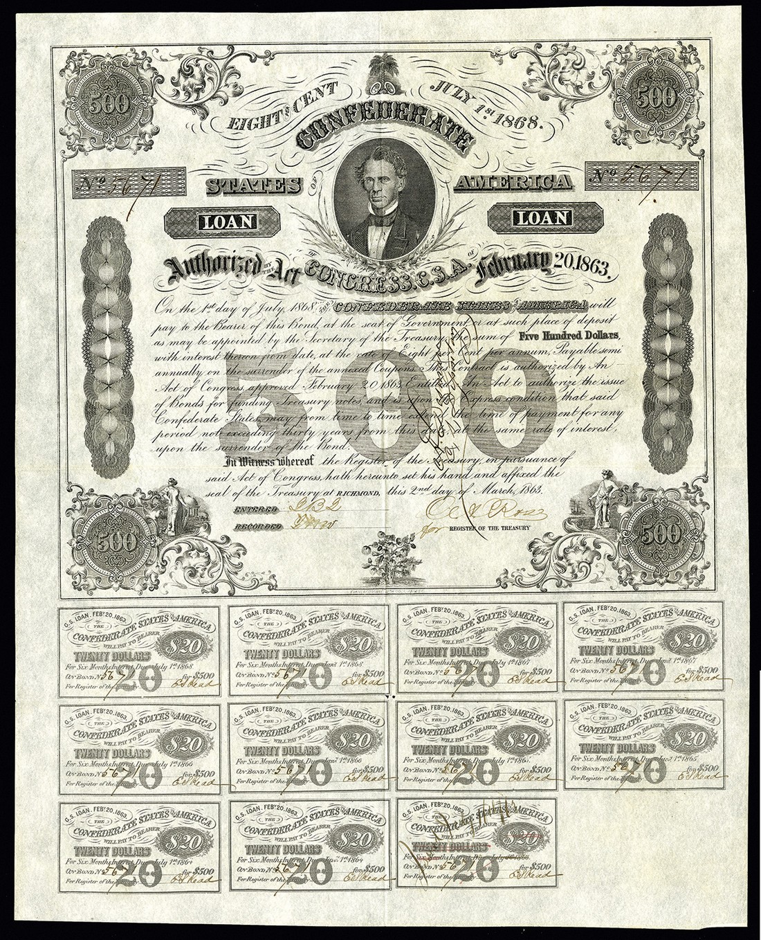 CSA. February 20, 1863. $500. Like Ball 192. No.5671. Memminger. On bluish banknote paper. Octagonal medallions. Endorsed on the front by hand by A. Desmare, Opelousas, Louisiana Depositary. Not listed in Ball. Rose. 11(complete) coupons. VF-EF. Tiny fold junction split, otherwise fresh and appealing.