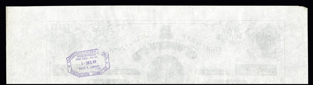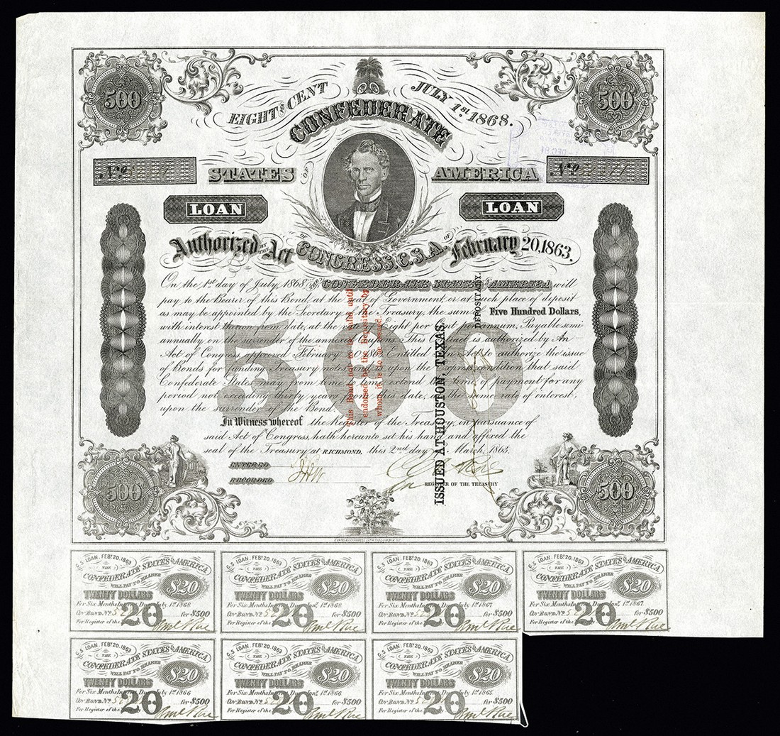 CSA. February 20, 1863. $500. Ball 199. No.52811. Memminger. On bluish banknote paper. Octagonal medallions. On front, red three line overprint and black "ISSUED AT HOUSTON, TEXAS." Endorsed by James Sorley. Rose. 7 coupons. AU. A beautiful example of this scarce Trans-Mississippi variety.