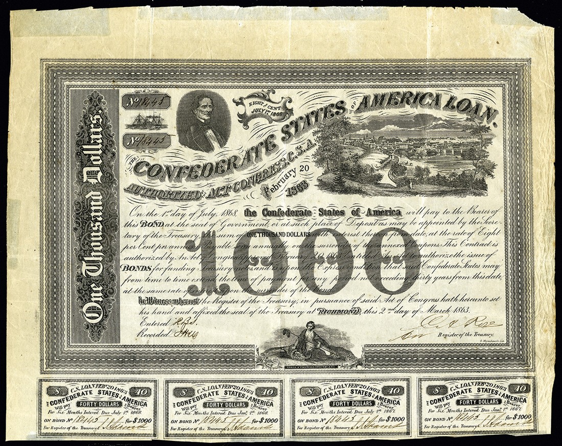 CSA. February 20, 1863. $1000. Ball 201. Cr. 125. Jefferson Davis. Richmond. Rose. No.18443. 4 coupons. VF. A piece of the wide upper margin is missing from the right corner.