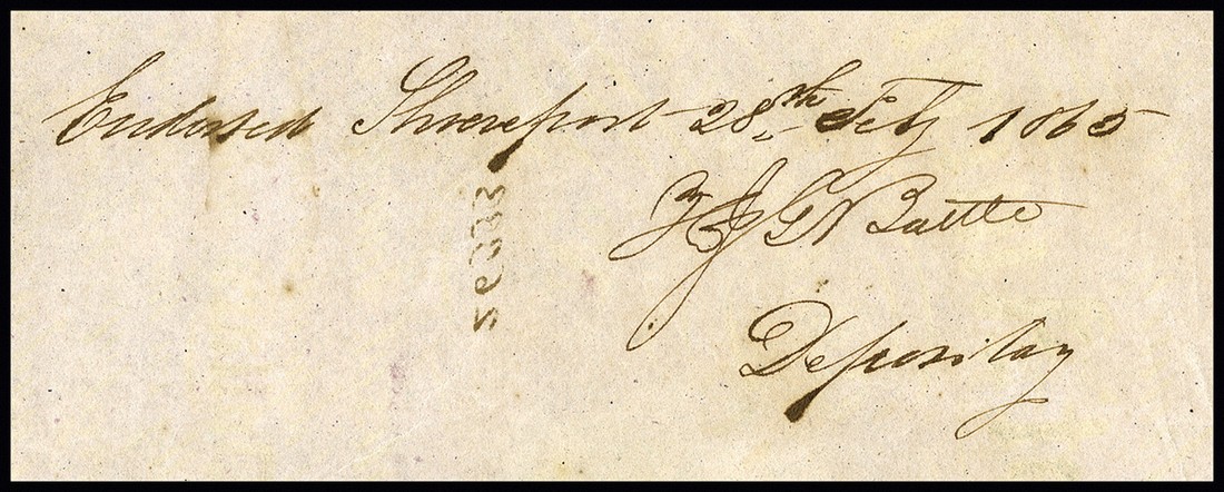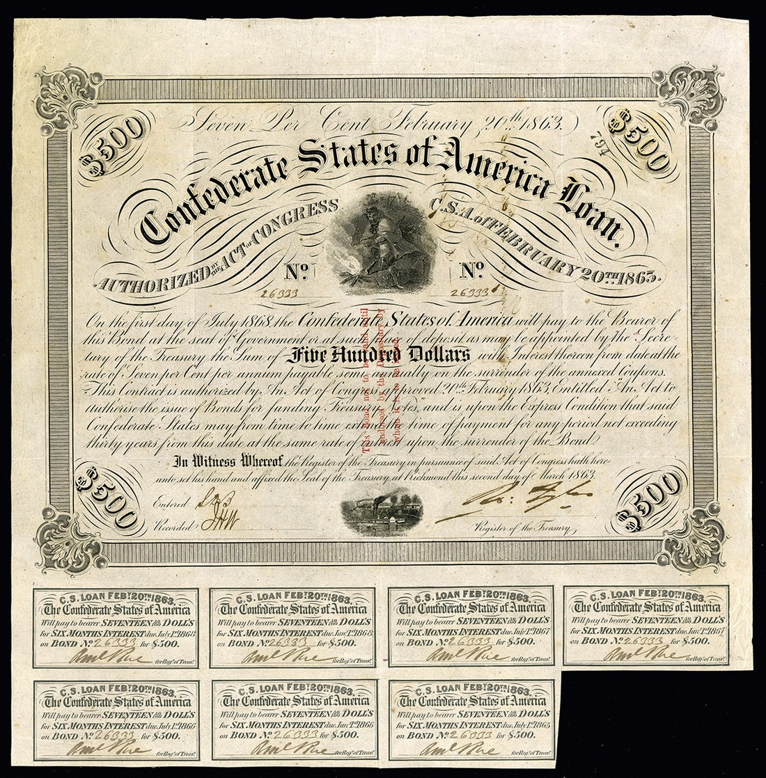 CSA. February 20, 1863. $500. Ball 232. No.26333. Soldier near campfire. On the front is a red three line overprint, and an endorsement by H. J. G. Battle, CSA Depositary at Shreveport, Louisiana . Tyler. 7 coupons. VF-EF. Just a bit of bleed through from the endorsement on the back, otherwise choice for the grade.