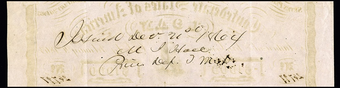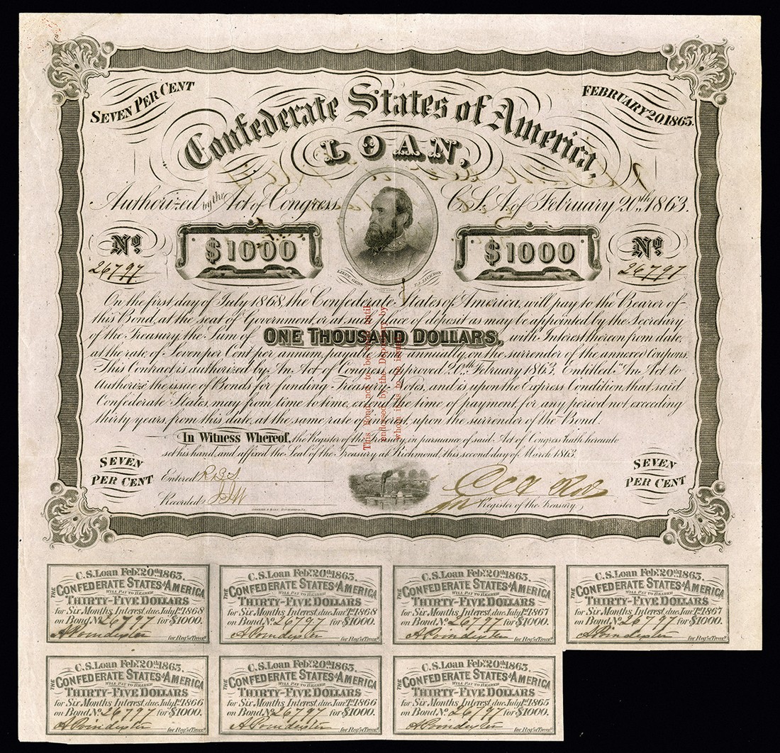 CSA. February 20, 1863. $1000. Like Ball 248. No.26797. Stonewall Jackson. Red three line overprint on face. Endorsed on the back by M. J. Hall, CSA depositary at Marshall, Texas. Not in Ball. Douglas did not mention any bonds issued in this number range. Rose. 7 coupons. VF+. A lovely example of a rare Trans-Mississippi bond.