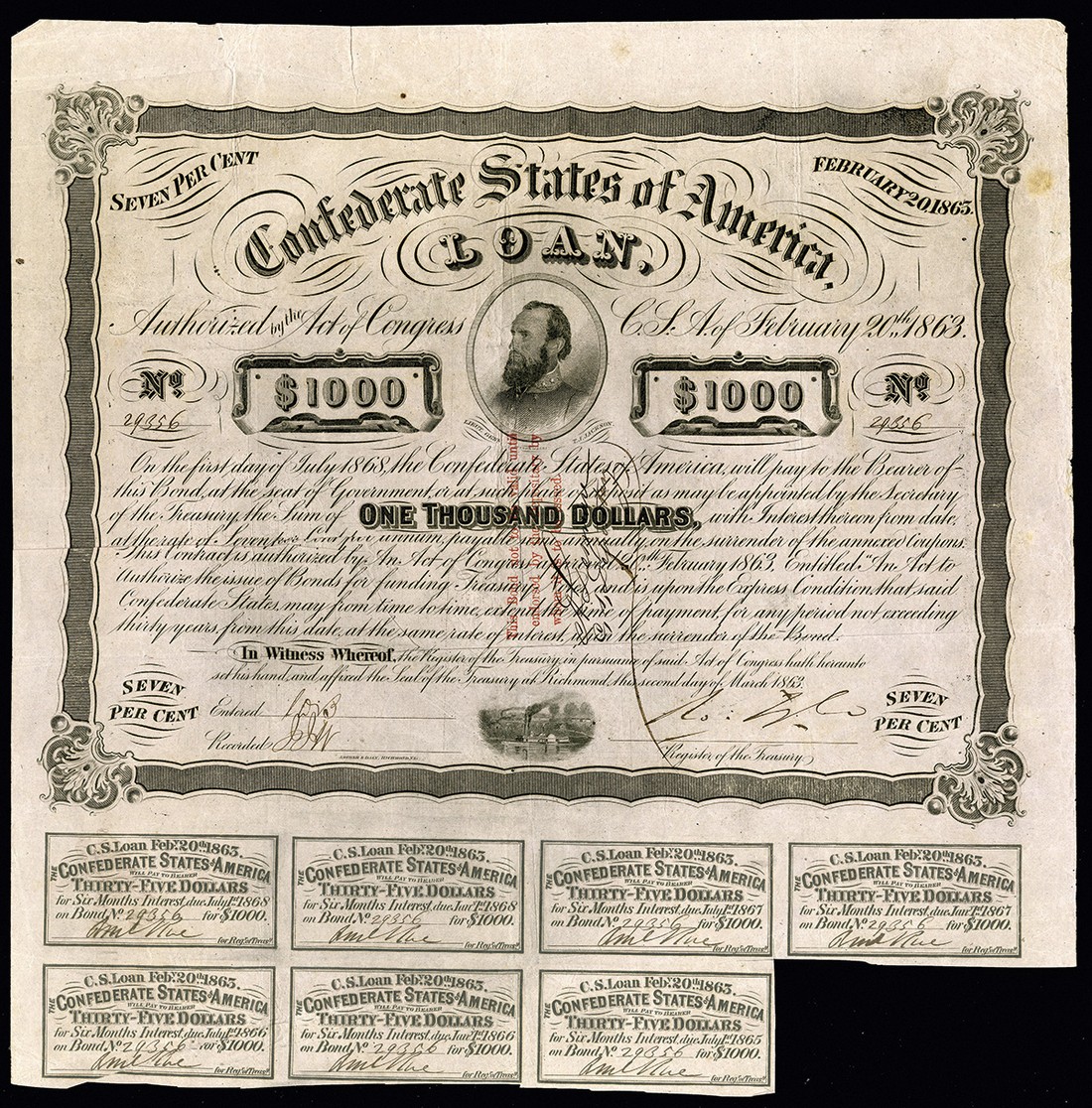 CSA. February 20, 1863. $1000. Ball 251. Cr. C122. No.49356. Stonewall Jackson. Pink paper. Tyler. 7 coupons. VF+. Red three line printed endorsement on the front, and "A. Desmare / C.S. Depositary."