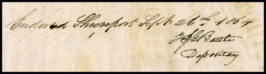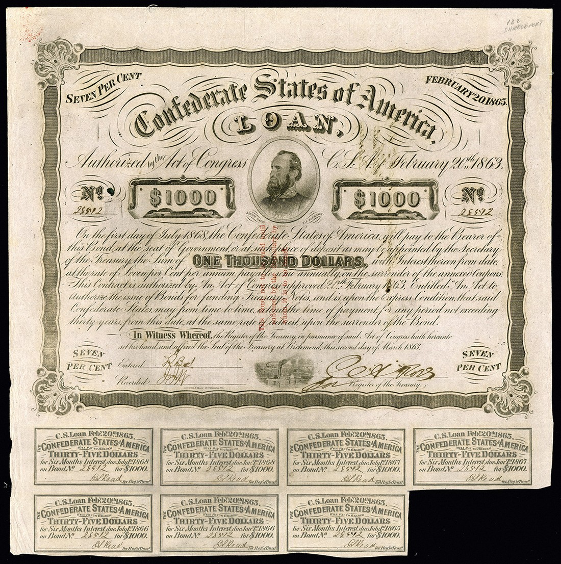 CSA. February 20, 1863. $1000. Ball 252. No.28572. Stonewall Jackson. On the front is a red three line overprint, and on the back is an endorsement by H. J. G. Battle, CSA depositary at Shreveport, Louisiana. Rose. 7 coupons. VF-EF. Pencil notation upper right margin.