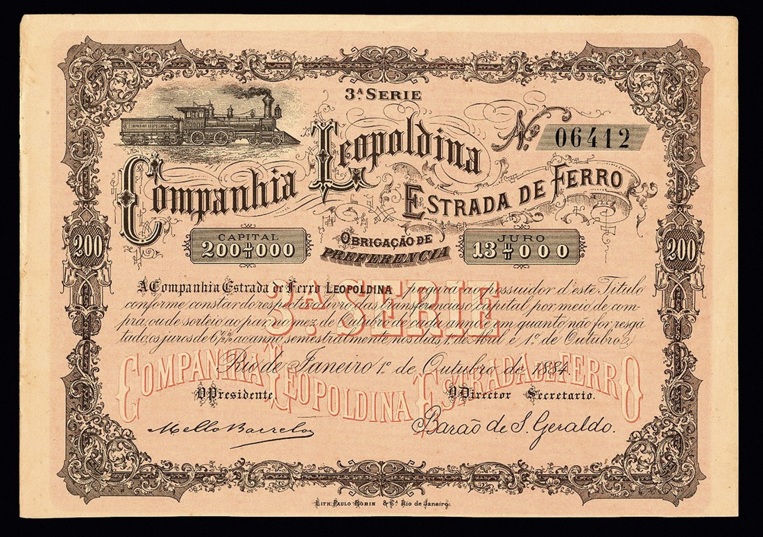 Companhia Leopoldina Estrada de Ferro, 200 reis preference share, Rio de Janeiro 1884, #06412, small format piece with intricate border, steam engine at top left, black on peach underprint, with coupons, together with Companhia Ferro Carril Carioca, 100,000 reis shares, Rio de Janeiro 189[5], #0024, electric tram crossing bridge at top, ornate border, brown on buff paper, and 200,000 reis share, not dated, #07006, vignette of horse drawn tram in coastal scene, ornate border, black, one piece with filing holes, otherwise VF and better. (3)