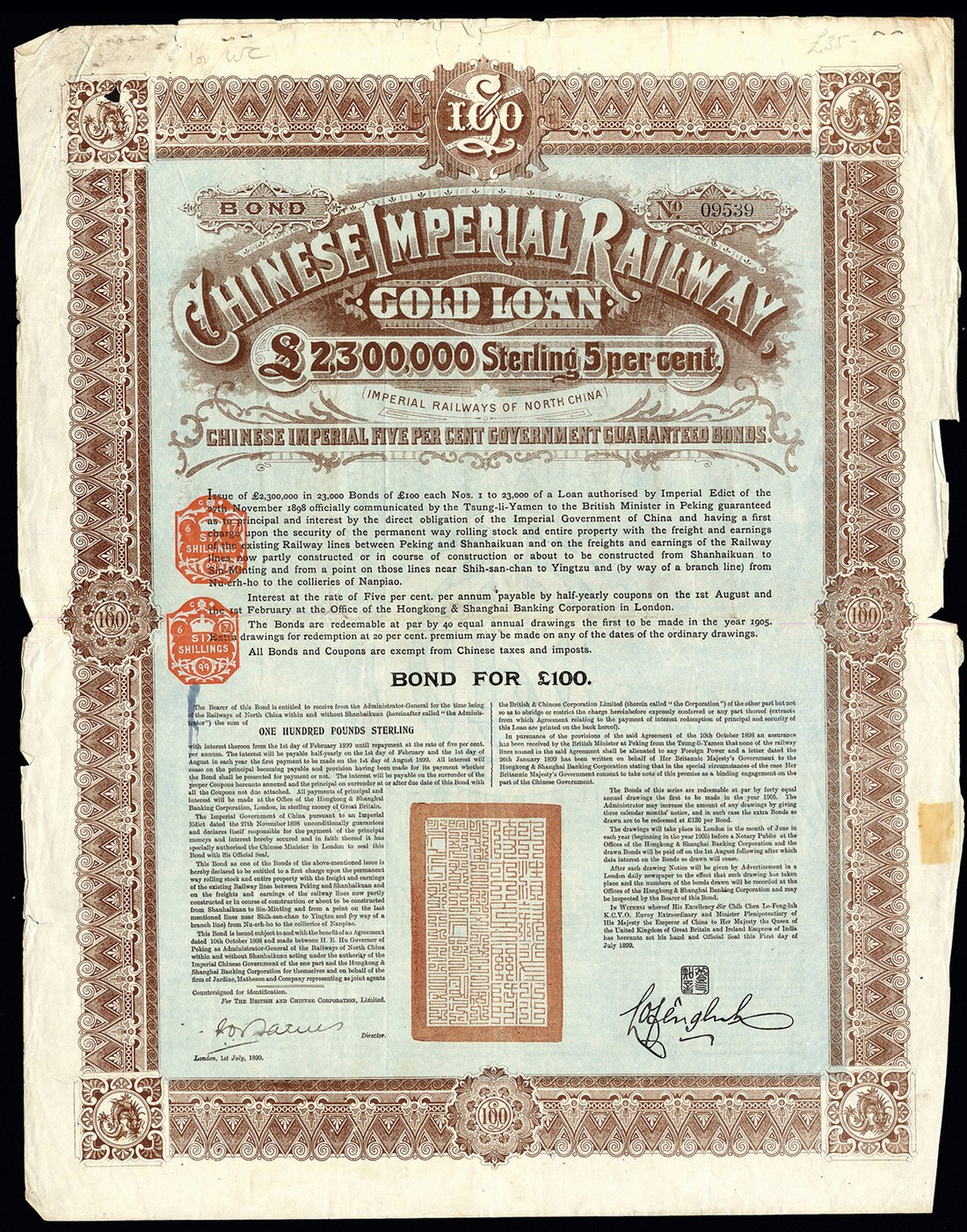 Chinese Imperial Railway 5% Gold Loan, 1899, bond for £100, #9539, large format, ornate border with pale blue underprint and red chop in centre with coupons, small tears , F-VF.