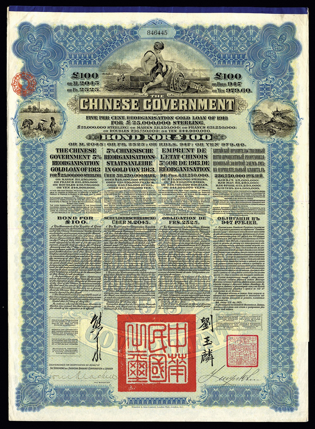 1913 5% Reorganisation Gold Loan, bonds for £20 and £100 issued by the Hongkong and Shanghai Banking Corporation, 'Mercury' at top, peasants and buildings at either side, brown and blue respectively, printed by Waterlow & Sons, with coupons, GVF. (2)