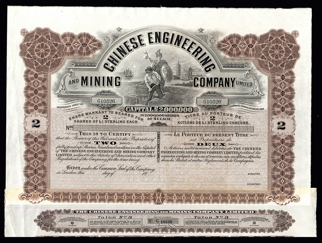 Chinese certificates (12), comprising; Chinese Engineering and Mining Company Ltd., un-issued bearer warrant for two shares of £1, London 19[--], Britannia looks over a miner at work, brown and black, printed by Waterlow & Sons; Gouvernement Générale de L'Indo-Chine, bond for 500 francs, Paris 1902, brown and olive green; Compagnie Générale de Chemins de Fer et de Tramways en Chine, 250 franc share, Brussels 1920, vignettes of railway bridge and buildings, orange-brown and black, cancelled; Gold Fields of Siam Ltd., 50 shares of £1, London 18[89], brown and blue; Tramways & D'Eclairage de Tientsin S.A.; Société des Tramways du Tonkin; Compagnie Financière Belgo-Chinoise and a group of 5 Japanese Military loans from the 1940's, VF and better. (12)
