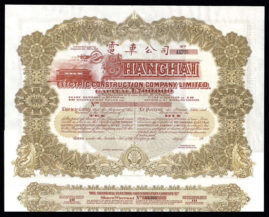 Shanghai Electric Construction Co. Ltd., a set of three specimen certificates, from the Bradbury, Wilkinson & Co. archives, for 10 shares (brown and black), 50 shares (green and black) and 100 shares (blue and black), capital £700,000, electric tram at top left, very ornate borders, numbered A1705, B1167 and C4180 respectively, with coupons, EF. (3)