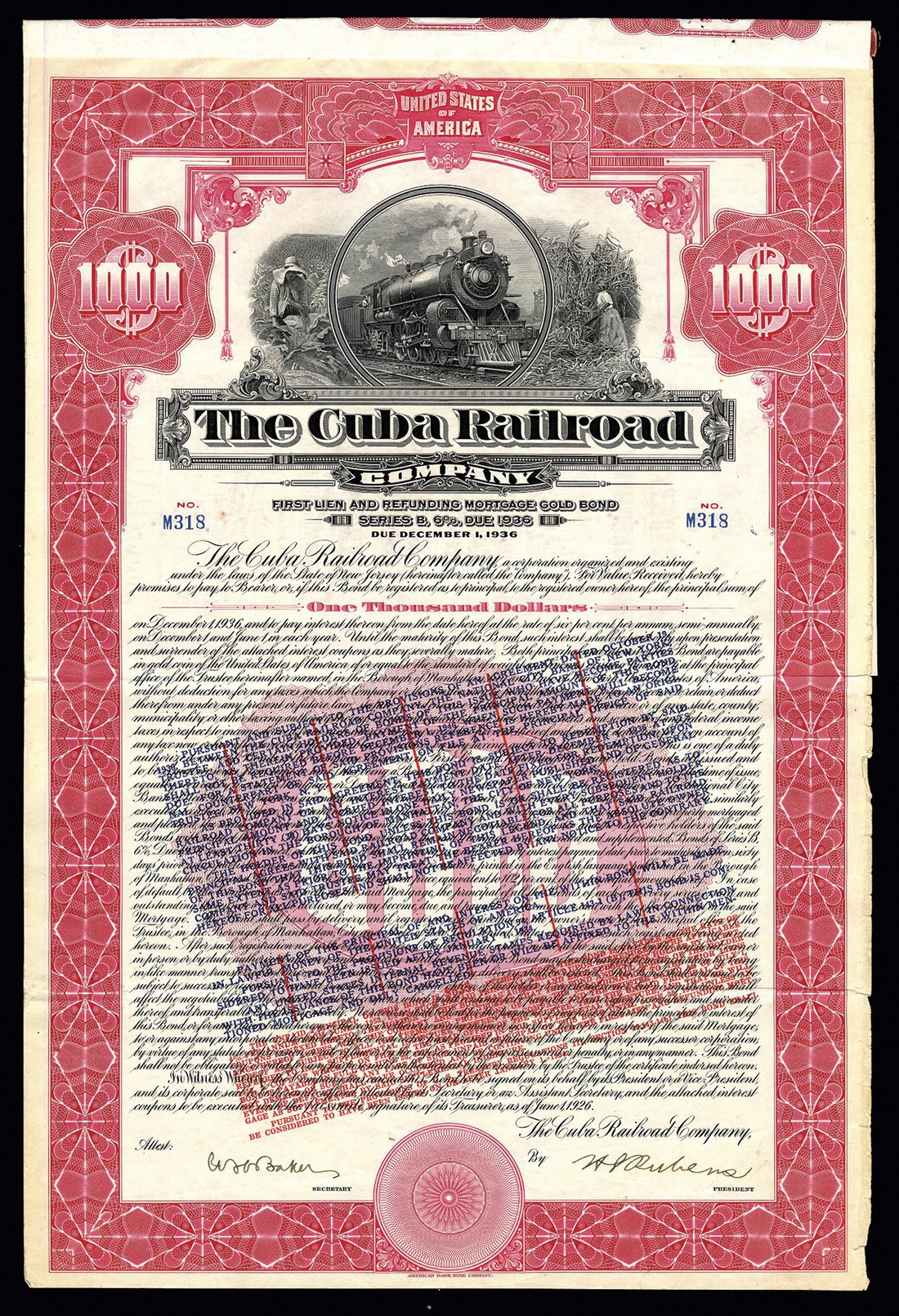 Cuba Railroad Company, small group comprising 10 shares, 19[14], 'less than 100' shares, 19[41], and 100 shares, 19[24], preferred stock, and two first lien and refunding mortgage gold bonds for $1000, series A, 1921, and series B, 1926, all have steam engine at top centre, together with; Cuba Eastern Railroad Company, $100 share, 190[8], steam train in centre of title, brown and black; Cuba Northern Railways Company, 5½ % first mortgage gold bond for $1000, 1927, vignette of ox cart, steam engine and carriage being loaded, orange and black this only fine; Consolidated Railroads of Cuba, 100 preference shares, [1937], and 'less than 100' preference shares, [1928], trio of vignettes at top centre depicting ox cart, steam train and mules; and Banco Territorial de Cuba, dividend share, Havana 1911, arms in centre flanked by Government building to left and ox wagon to right, green, some cancelled, generally VF. (10)