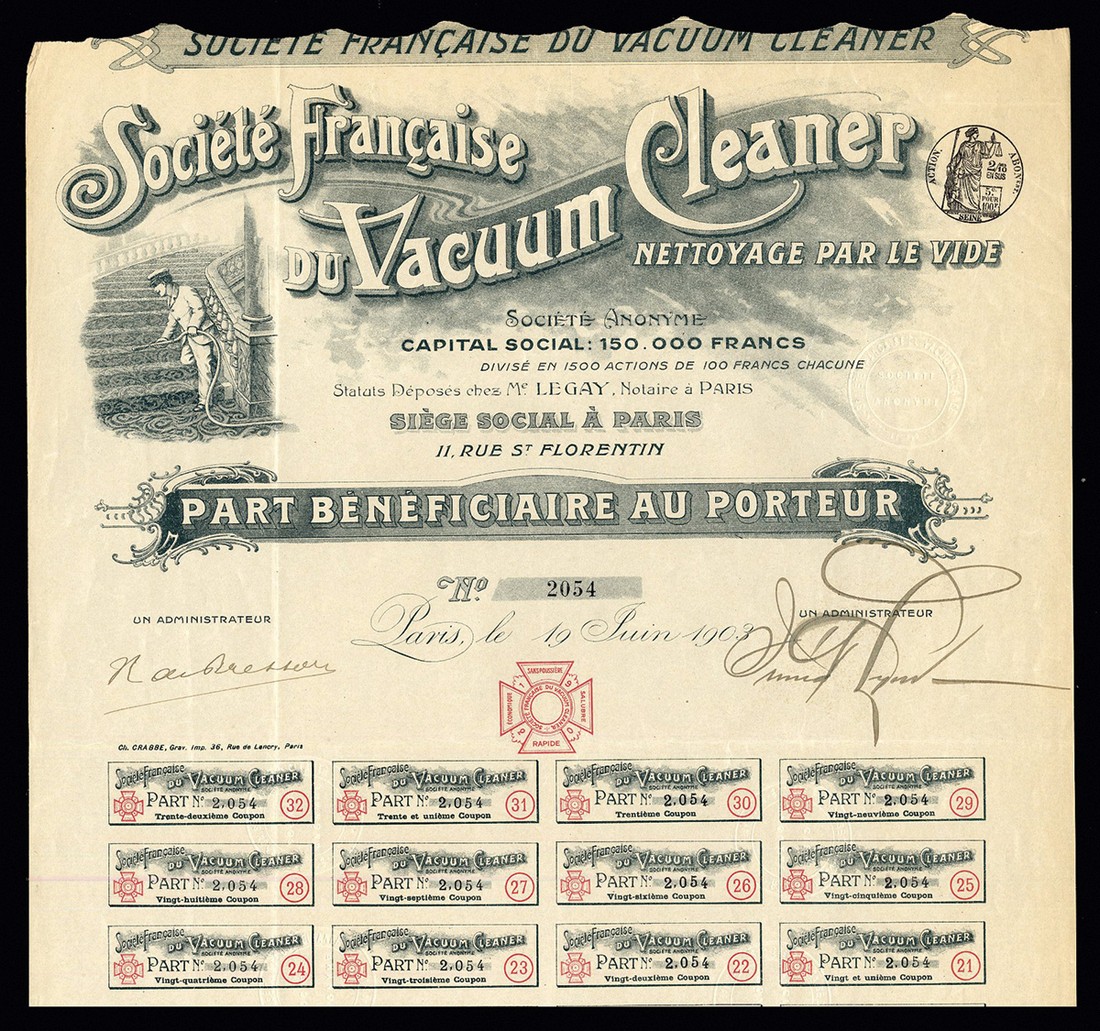 Société Française du Vacuum Cleaner, 100 franc bearer share, Paris 1903, no.2054, vignette of vacuum cleaner in use on grand staircase top left, black/grey, with coupons, AEF.